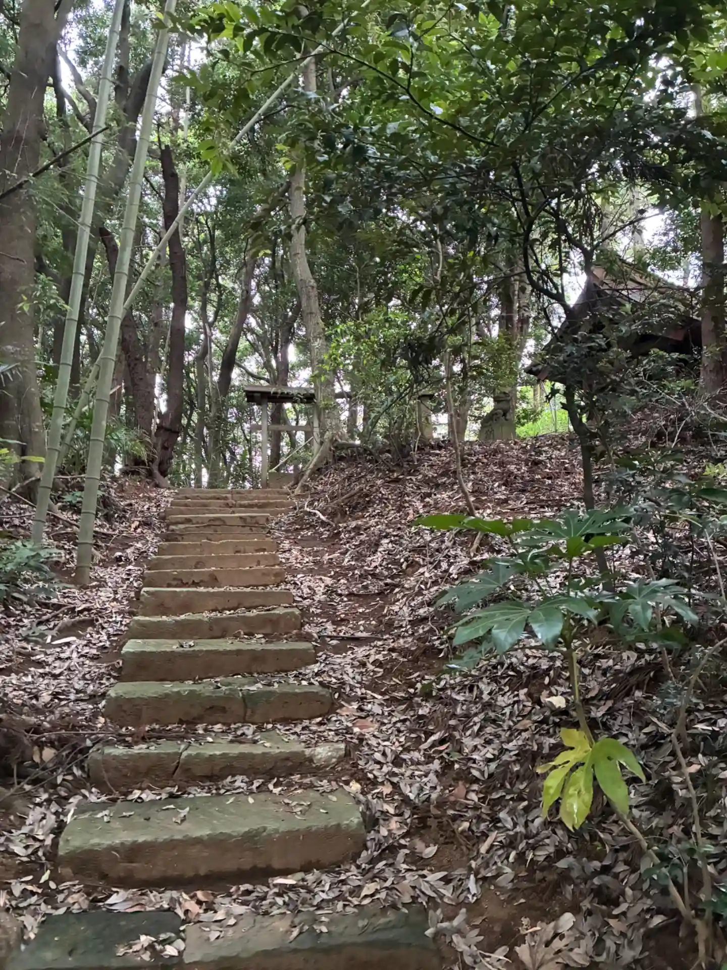 民家の敷地と地続きなので入っていいのか心配になりますが問題はないみたいです。社殿の脇に龍の口があり、かつては池があったのかもしれません。神社向かって右奥に本殿への石段があります。こちらには絵馬や鉄草履が奉納されていました。