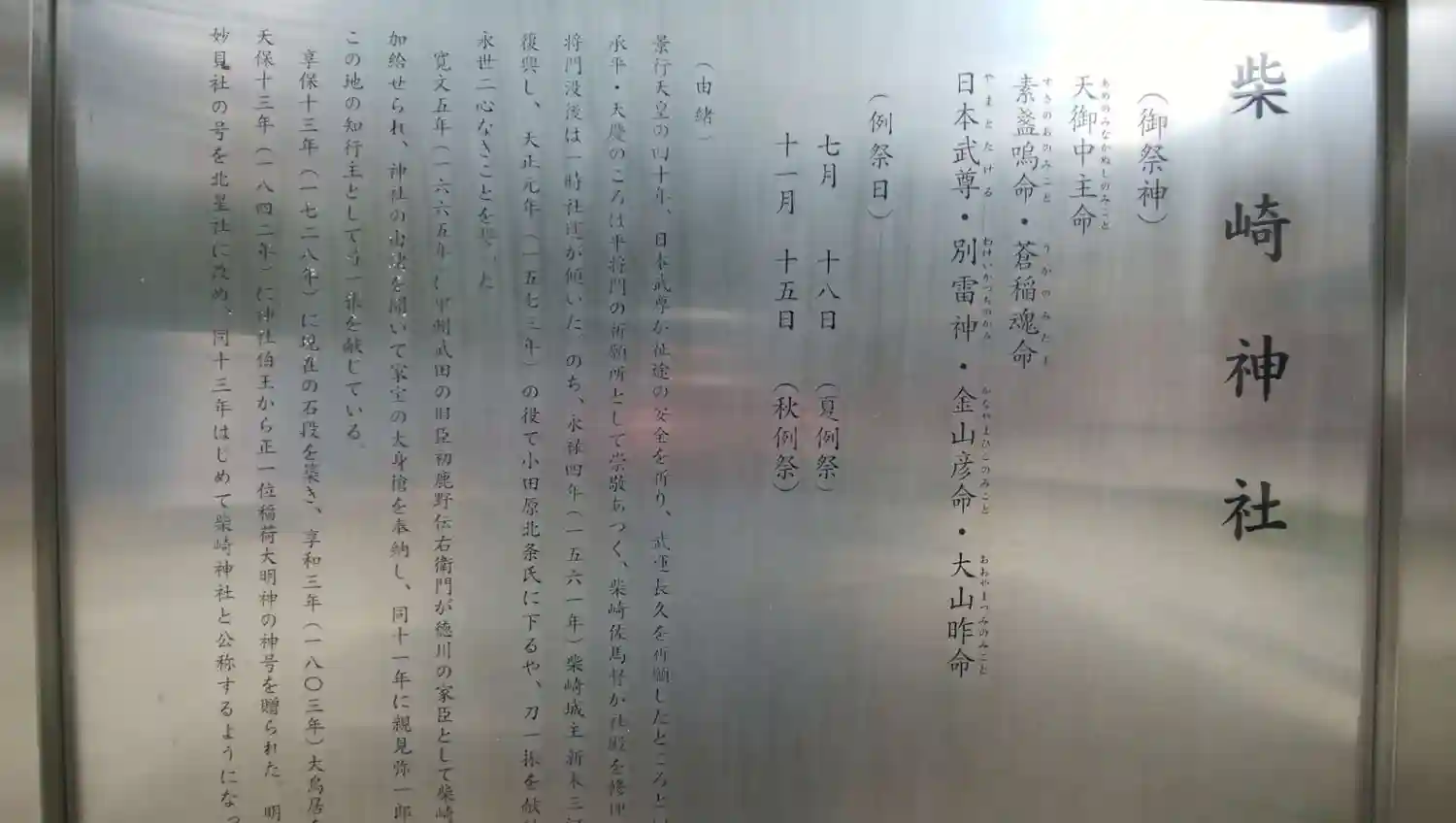 | ご由緒 | 柴崎神社は、旧水戸街道、柴崎字天王谷にある。祭神は天御中主命で、相殿に素盞鳴尊、蒼稲魂尊の二神を祭りべつに日本武尊、別雷神、金山彦命、大山昨命を合祀している。
