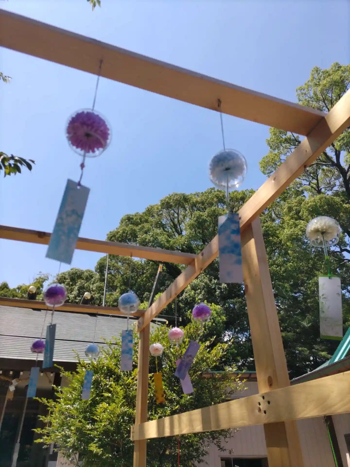 参道奥に拝殿、手前の風鈴が涼しげです