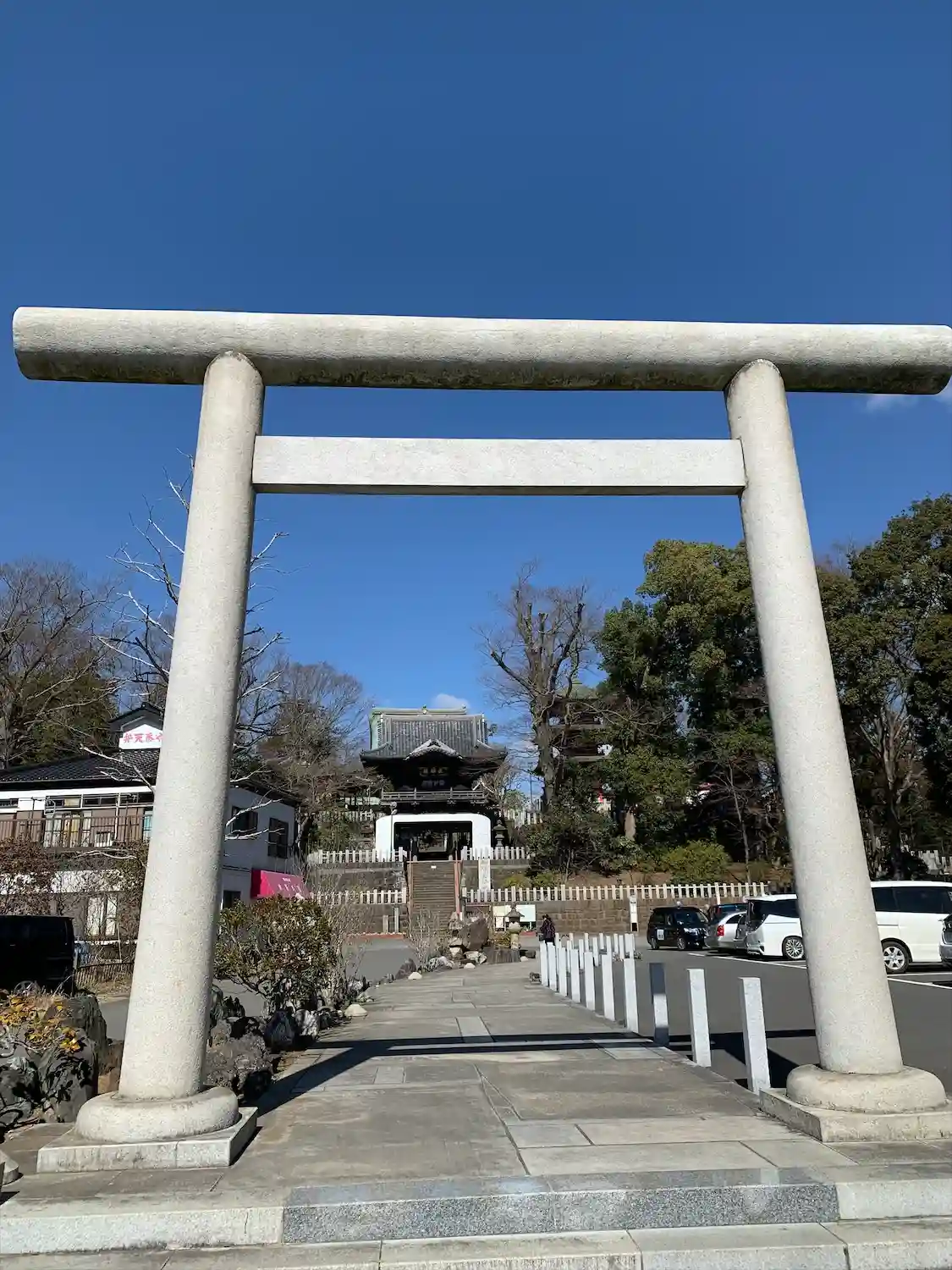 駐車場の半ばに楼門に向かうように鳥居があります。あれ?ここはお寺なのに、鳥居がある、、と不思議な感…