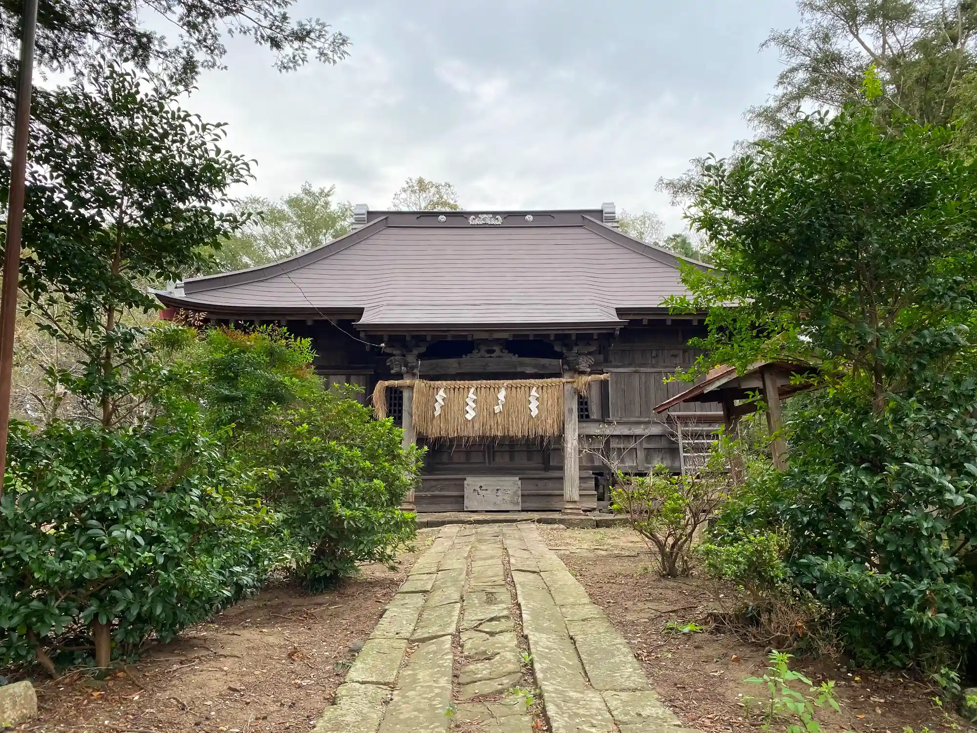 <拝殿>全景。屋根は新しそうだが、躯体は柱などを見ると年季が入っている。拝殿前に紙垂の付いた藁の暖簾が掛かっているところは奥の宮と同じ。
