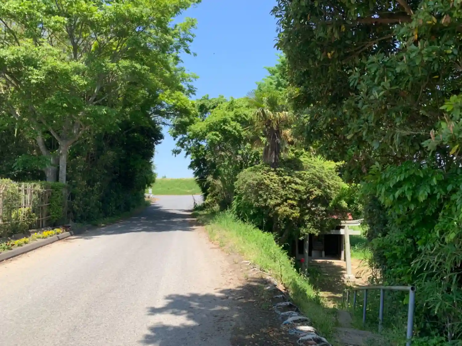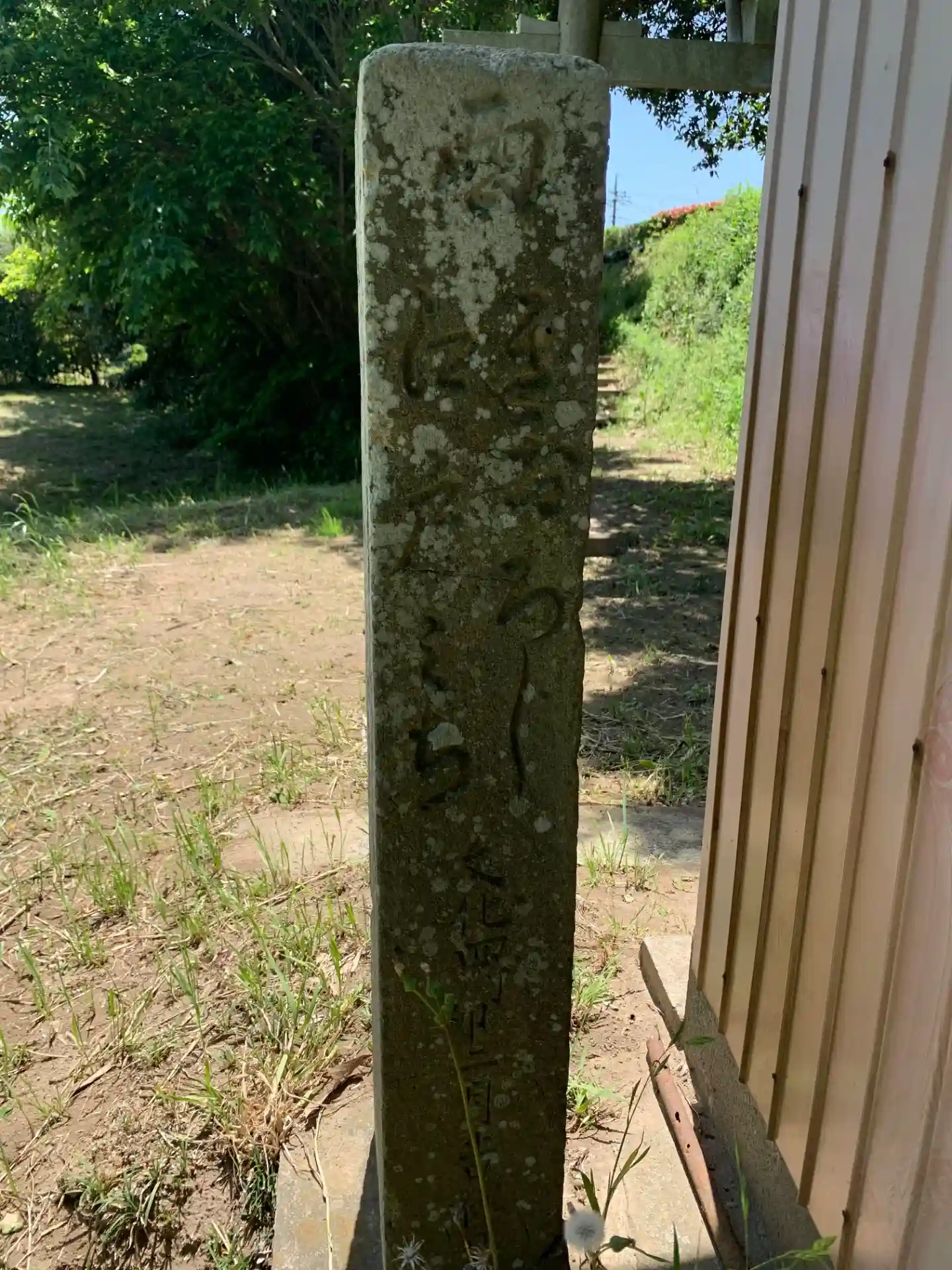 堤防へ向かう途中の道にある神社。一段下がったところにあります。文化4年の古い道標があり、実際は平仮…