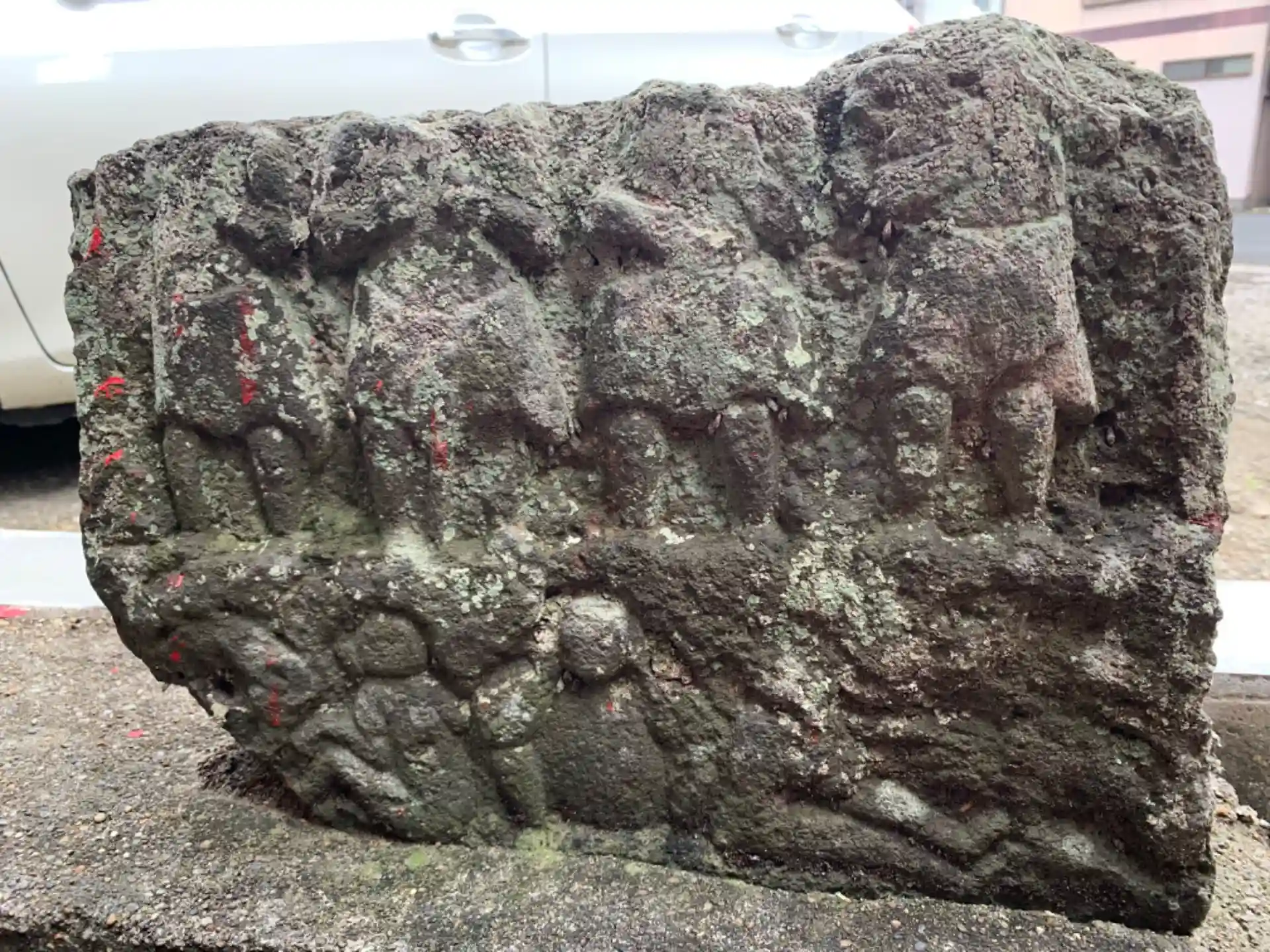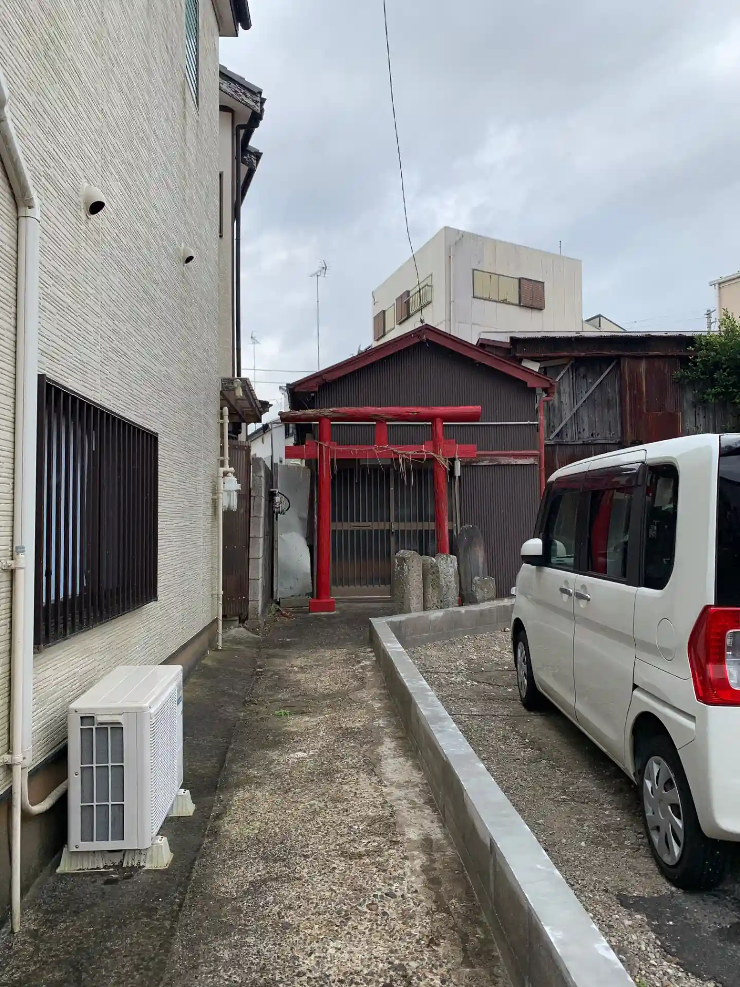 小さな駐車場の奥に数基の庚申塔と鳥居があります。