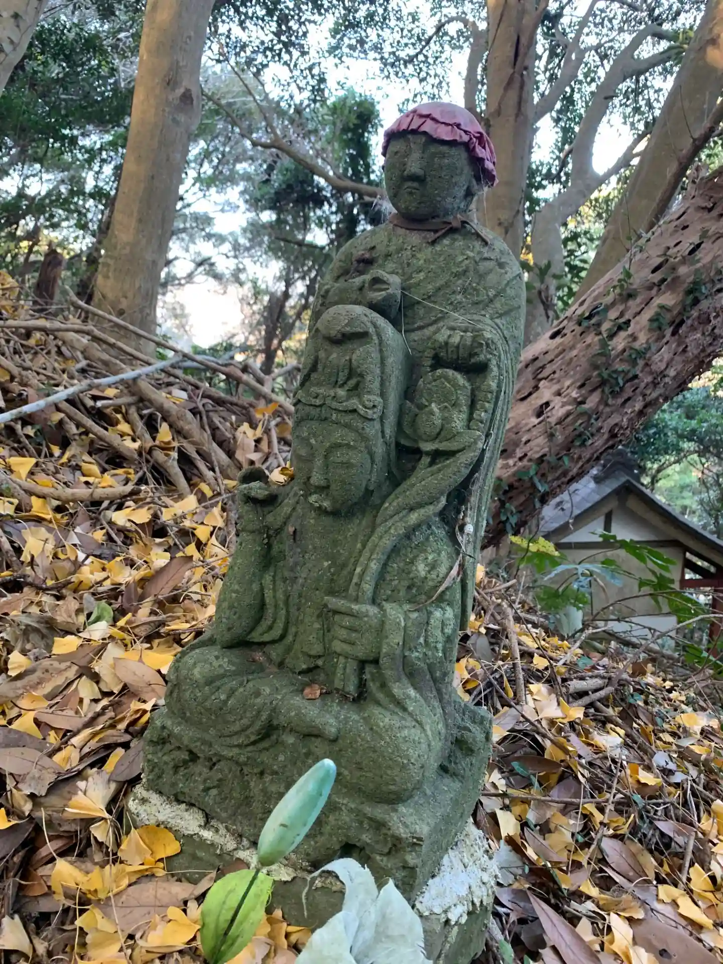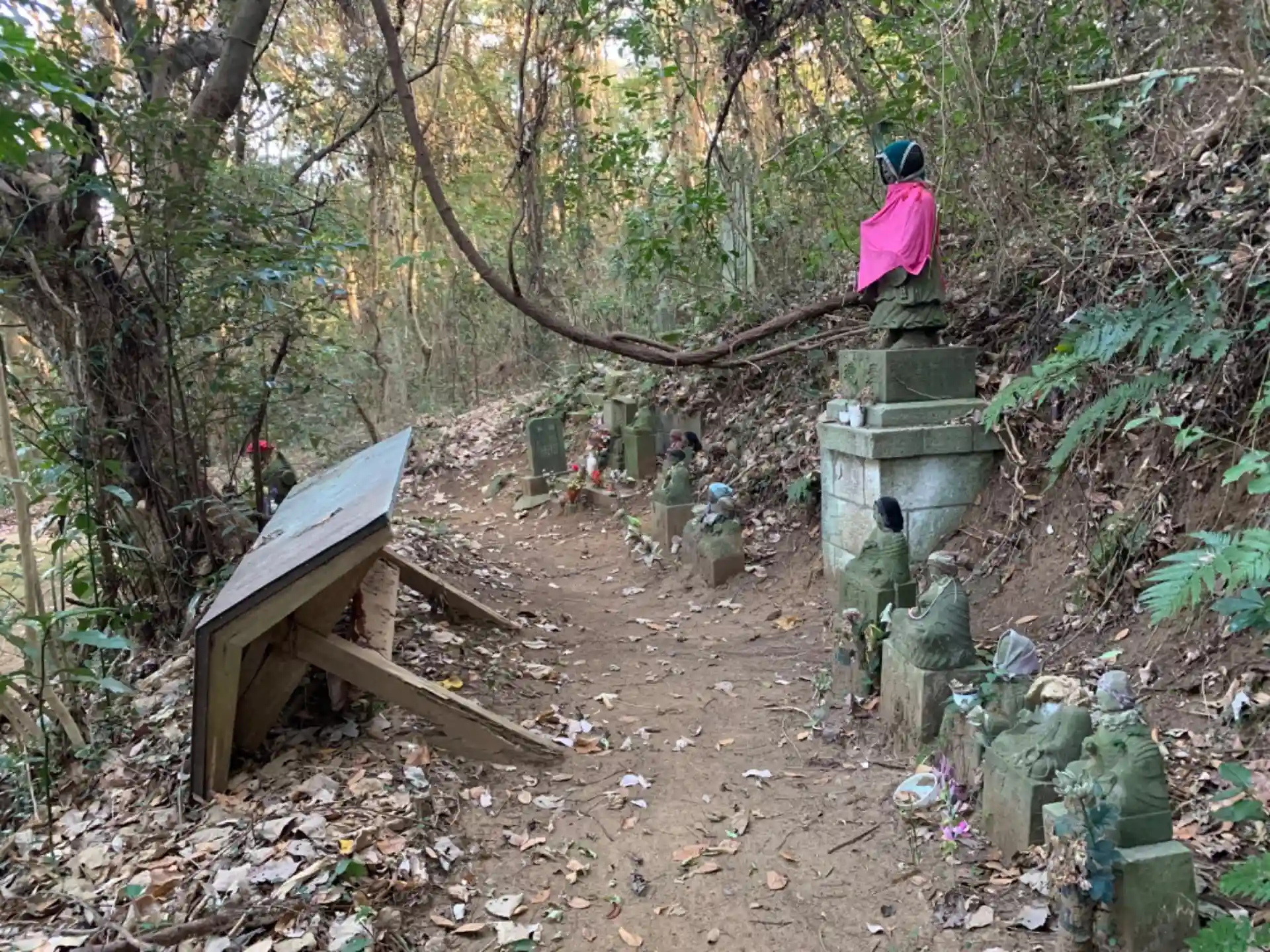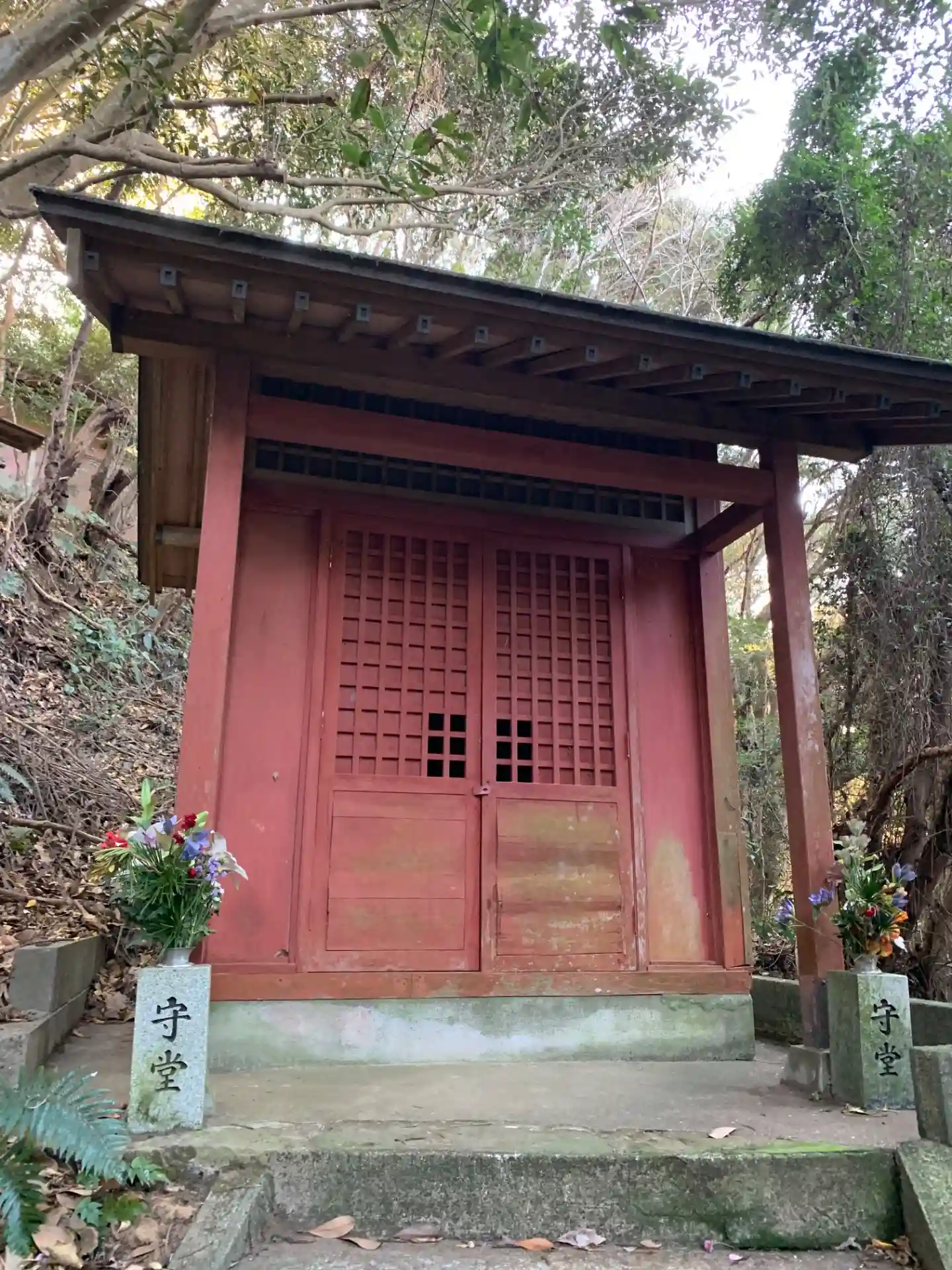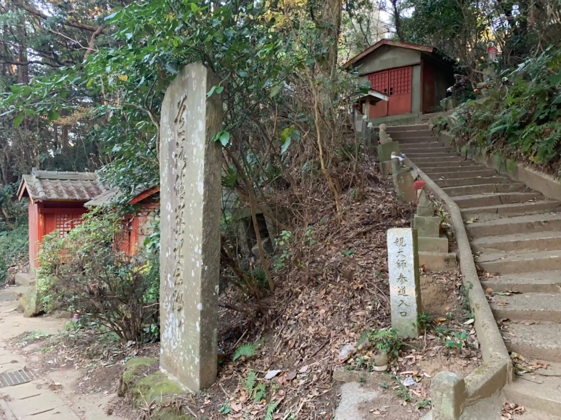階段を登ると二つお堂があり、赤くて小さい方には看板が、一番高い方には境内に無数の弘法大師像が並んでいます。