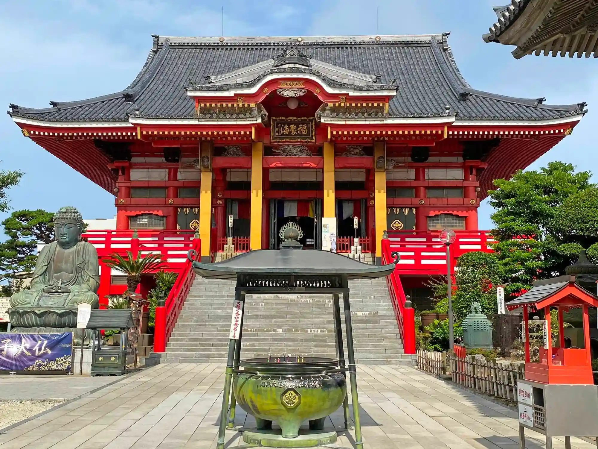 創建は奈良時代の728年、2人の漁師が海で観音像をすくい上げ、のちに当地を訪れた弘法大師が開眼し堂宇に安置したと伝わる。鎌倉時代以降は、海上(うながみ)長者という豪族が財を惜しまず投入したため壮麗な伽藍が整備され、寺運は興隆したが、太平洋戦争時の米軍による攻撃で多くを焼失し、露天の大仏・青銅製の阿弥陀如来坐像のみが残ることとなったとのこと。