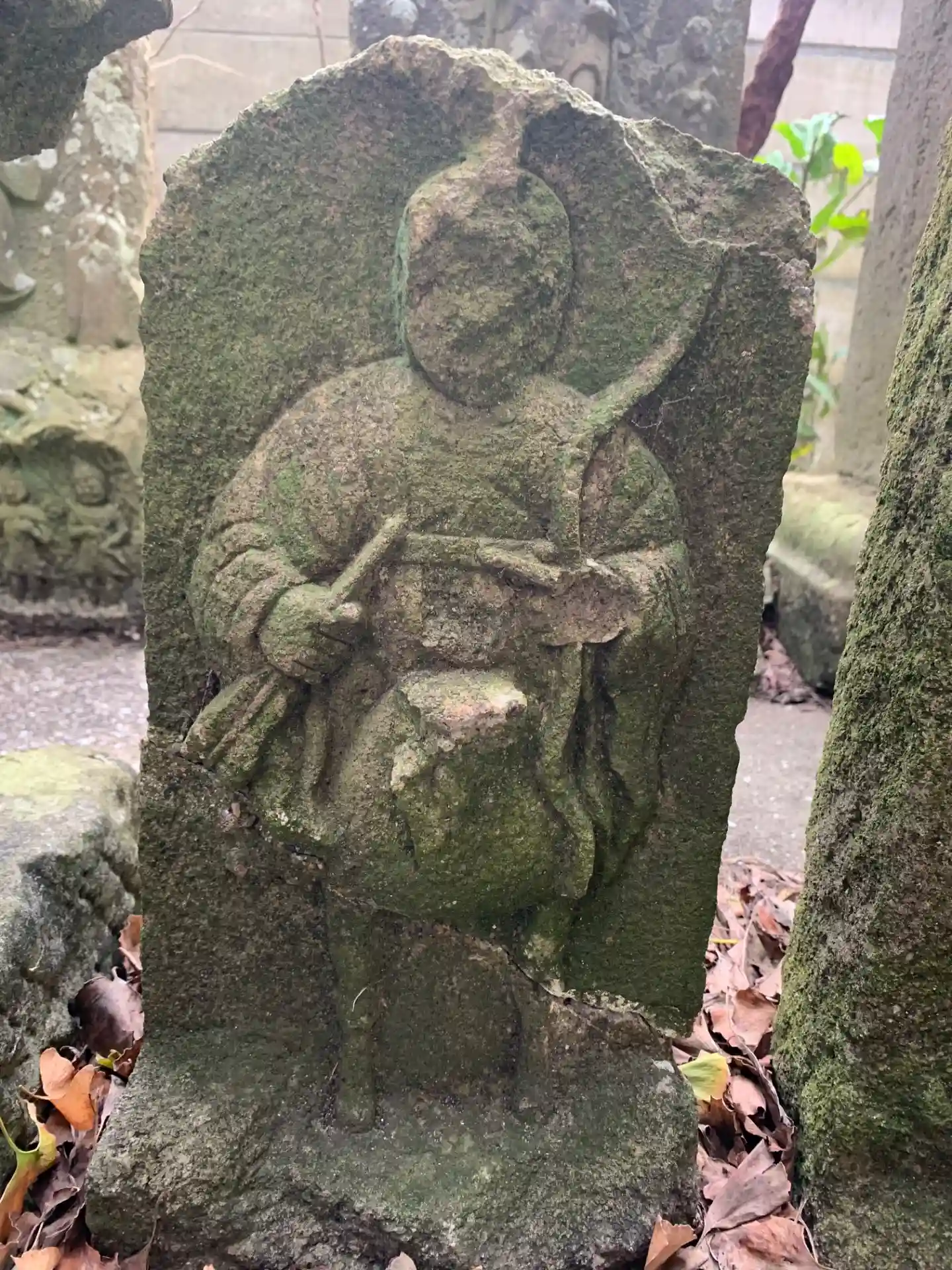 狛犬を備えた境内社の裏に庚申塔がたくさん建っています。文字と三猿で構成された庚申塔には「奥州〜」と…