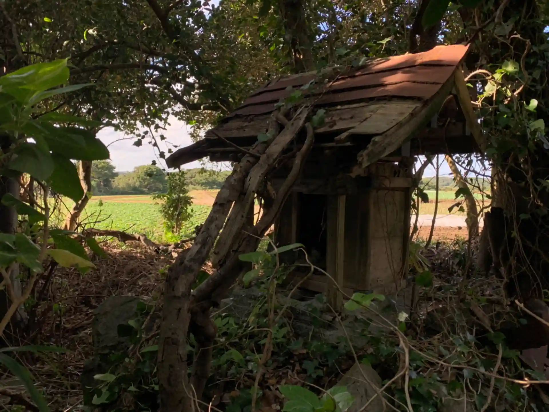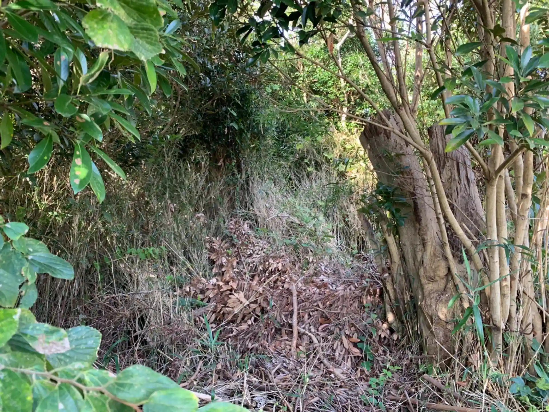 畑に面する藪の中にあります。過去のGoogleマップの投稿から参道にお犬様の像があったことがわかりますが、今は参道ごと埋もれていました。