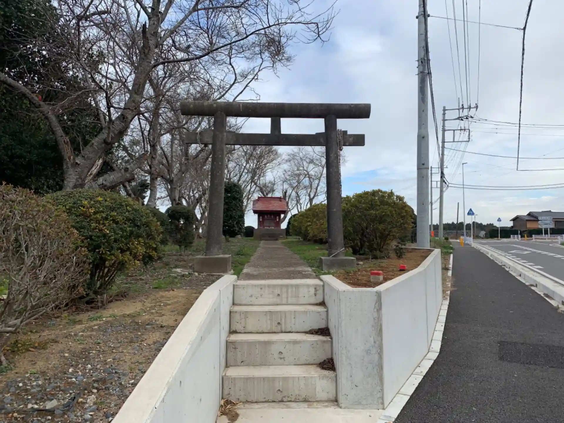 街道や枝道が多く交差する場所にあるお社。道路の向かいには東西南北を示す道標があり、昔から多くの道が交差していたことがうかがえます。
