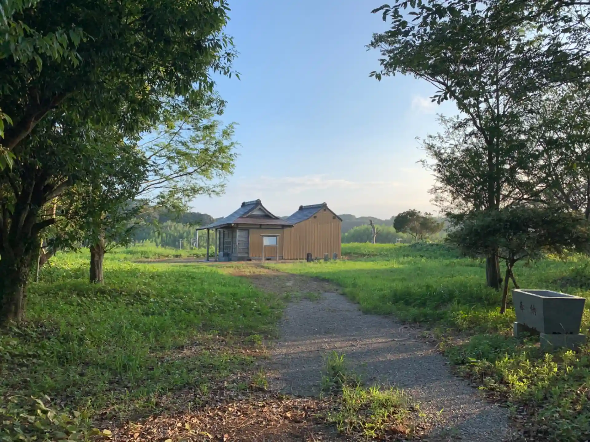 分かりづらいですが、鳥居が田んぼに面しています。近くには廃畜舎が蔦に埋もれていました。緩やかな丘の上のかなり広い境内に社殿が建っていました。