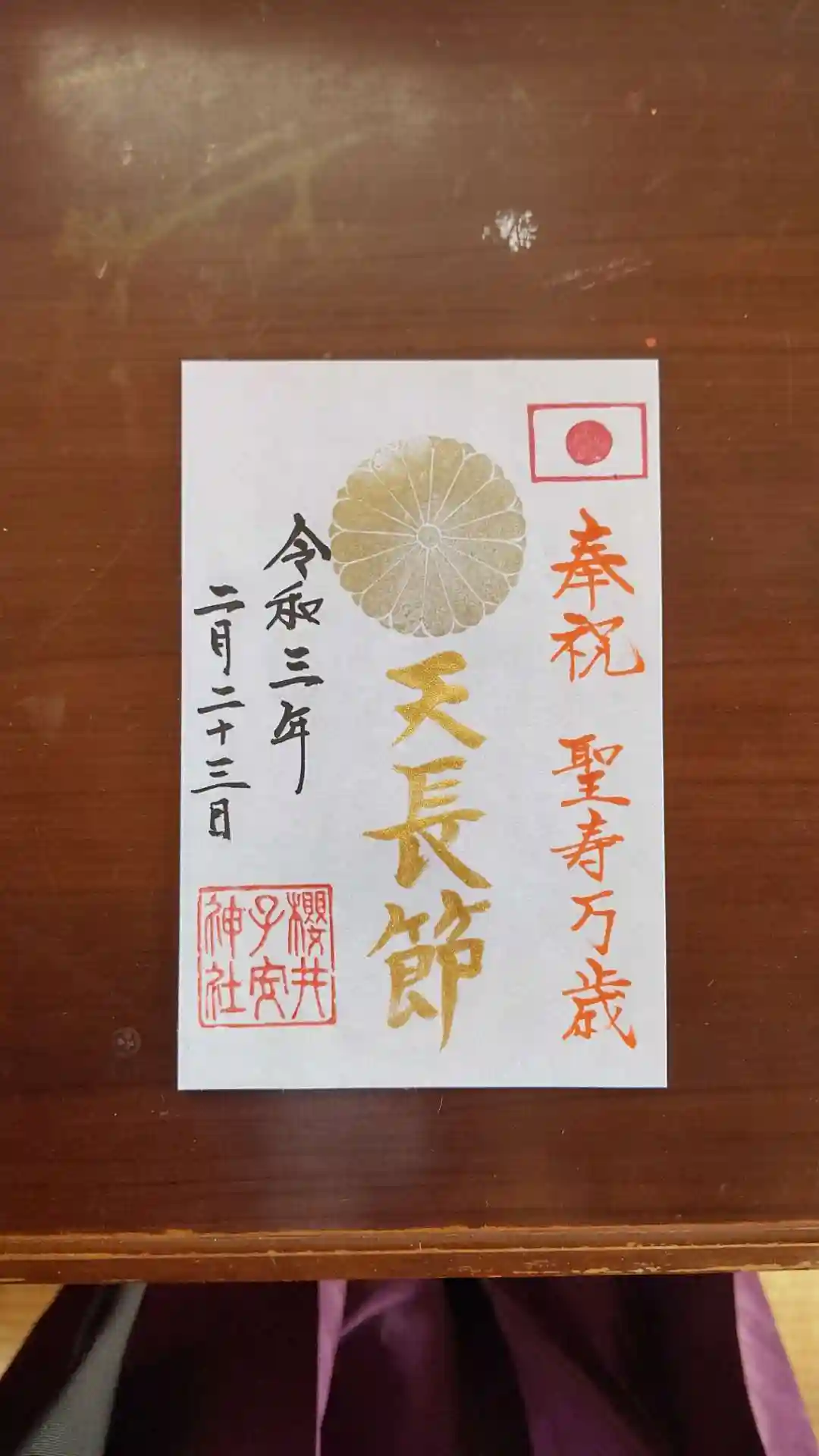天皇誕生日である2月23日限定で、天長節を奉祝し、聖寿万歳を祈念して御朱印を頒布致します。