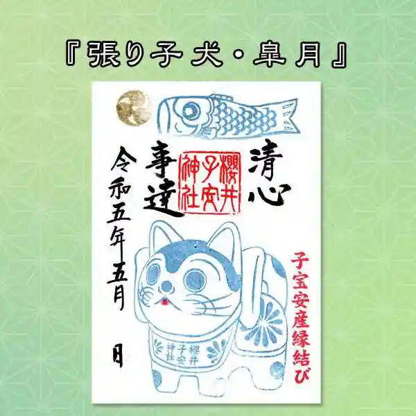 櫻井子安神社の拝殿にて目を引く縁起物の張り子の犬を配した御朱印です。5月らしく鯉のぼりと一緒に登場です🎏