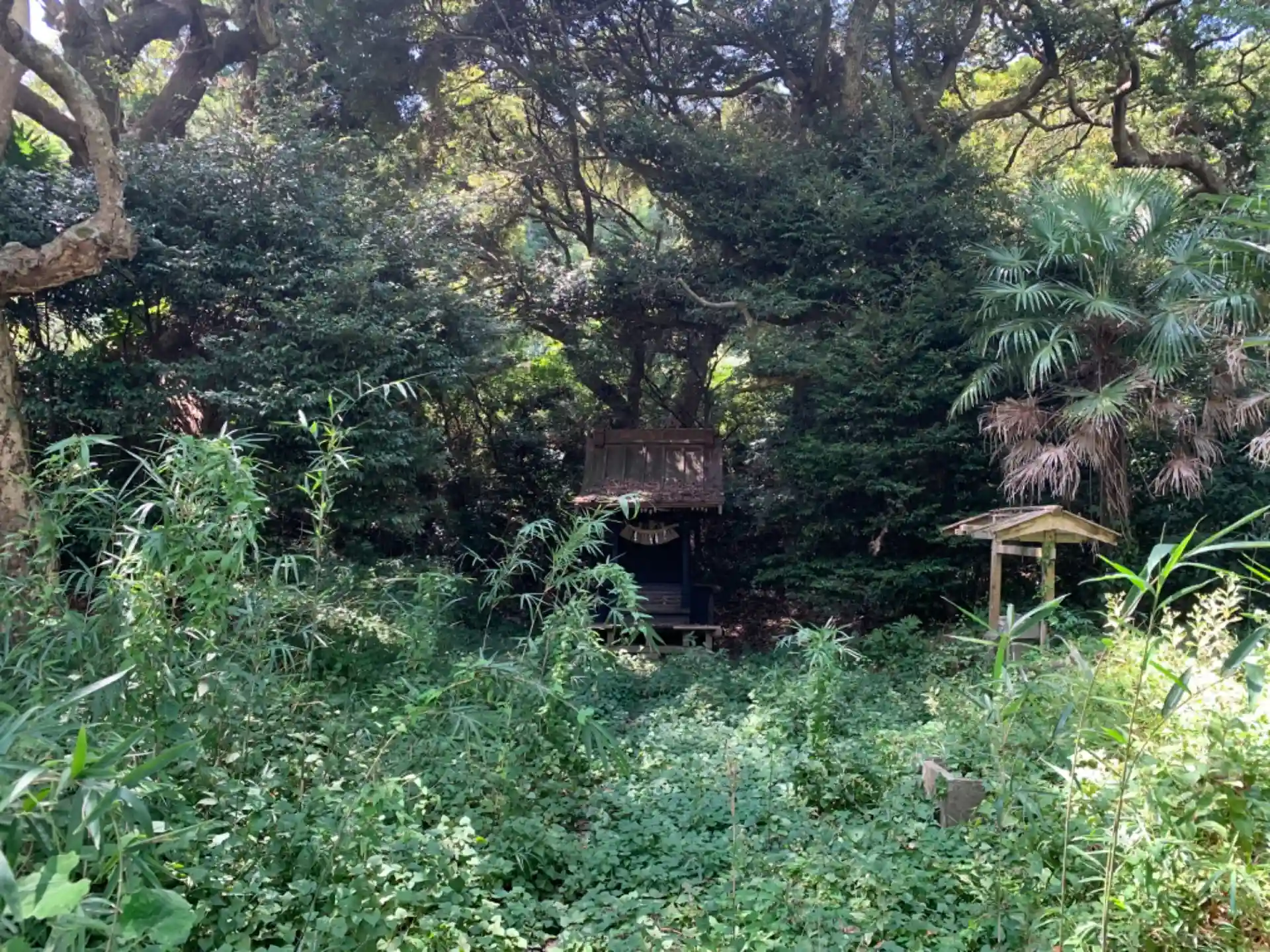 田んぼを見守る小さな神社。夏なのもあって下草や笹が繁茂しており、自然に還りつつありました。無補正で良さげな画を撮るなら朝頃に行くのが良さそうです。