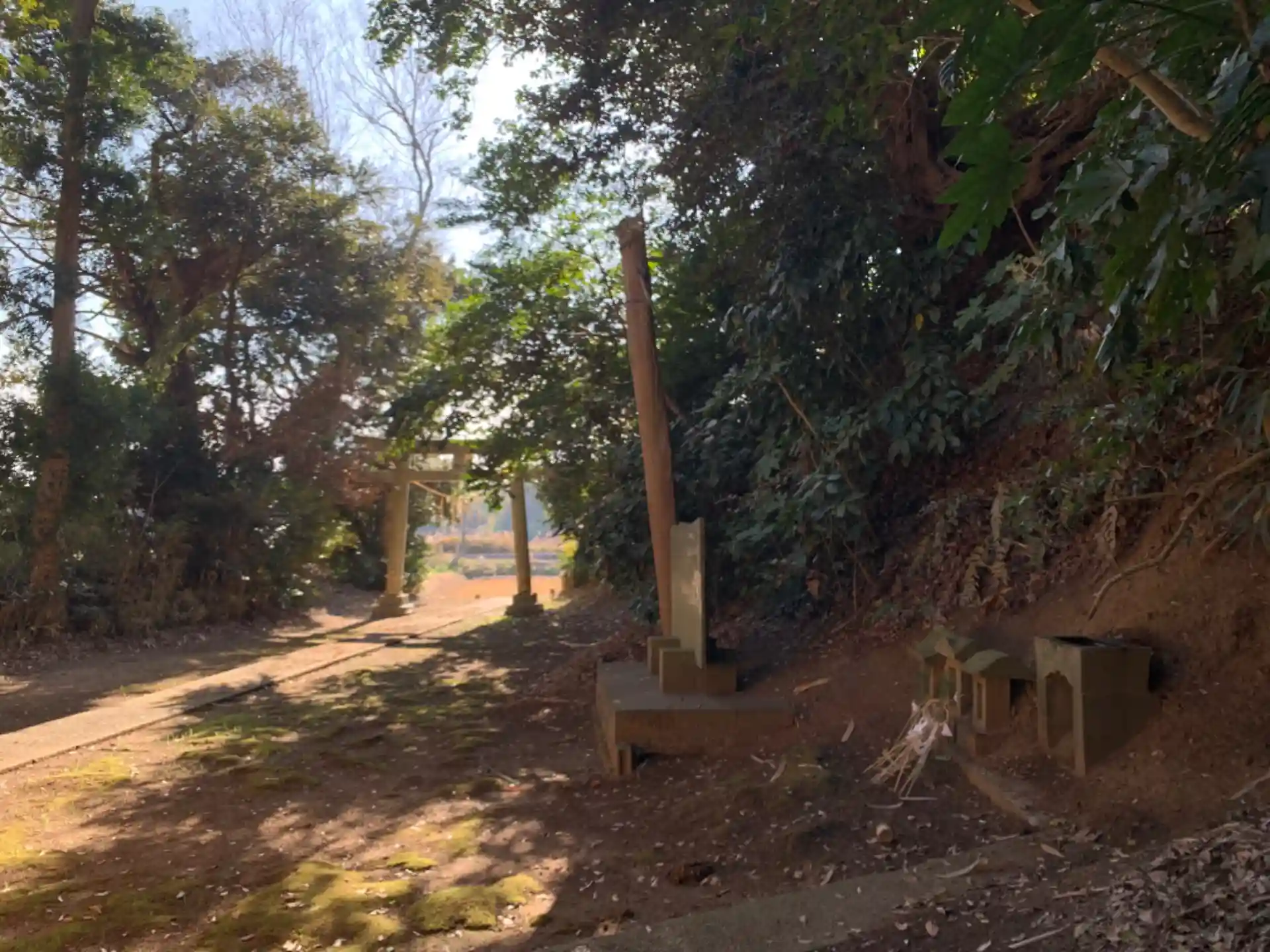目の前に田んぼと線路が広がる神社。境内には石造物と貯水用の穴がありました。