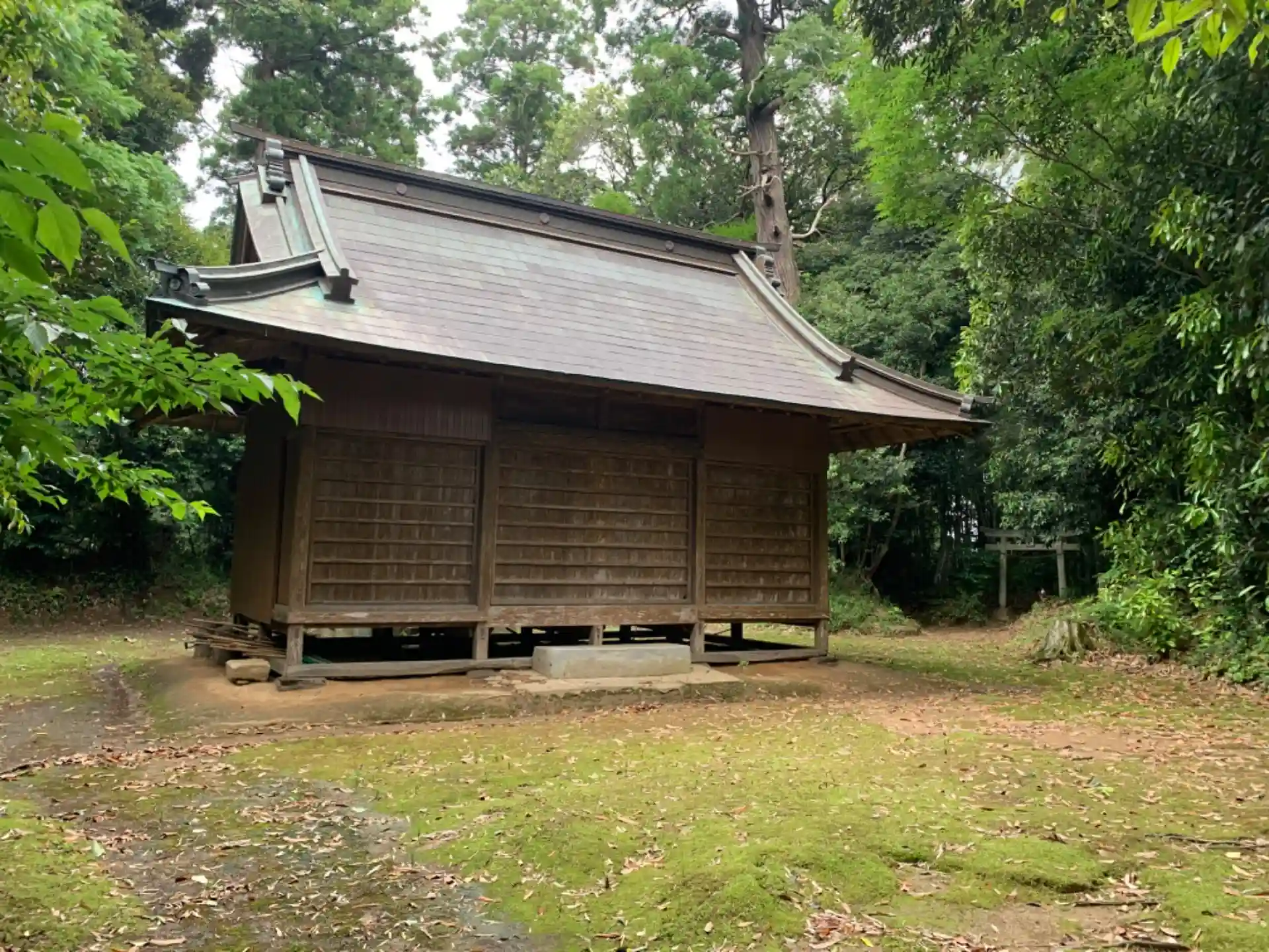 地理院地図を見ないと入口を見つけるのは難しそうです。石段は古びていながらも整っており、杉並木の参道は分厚い苔に覆われています。本殿彫刻を拝観することができました。