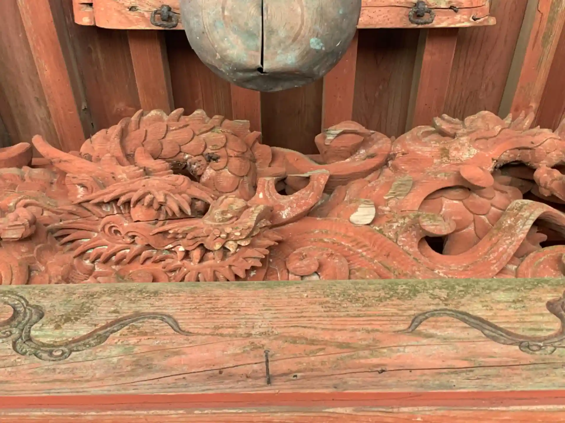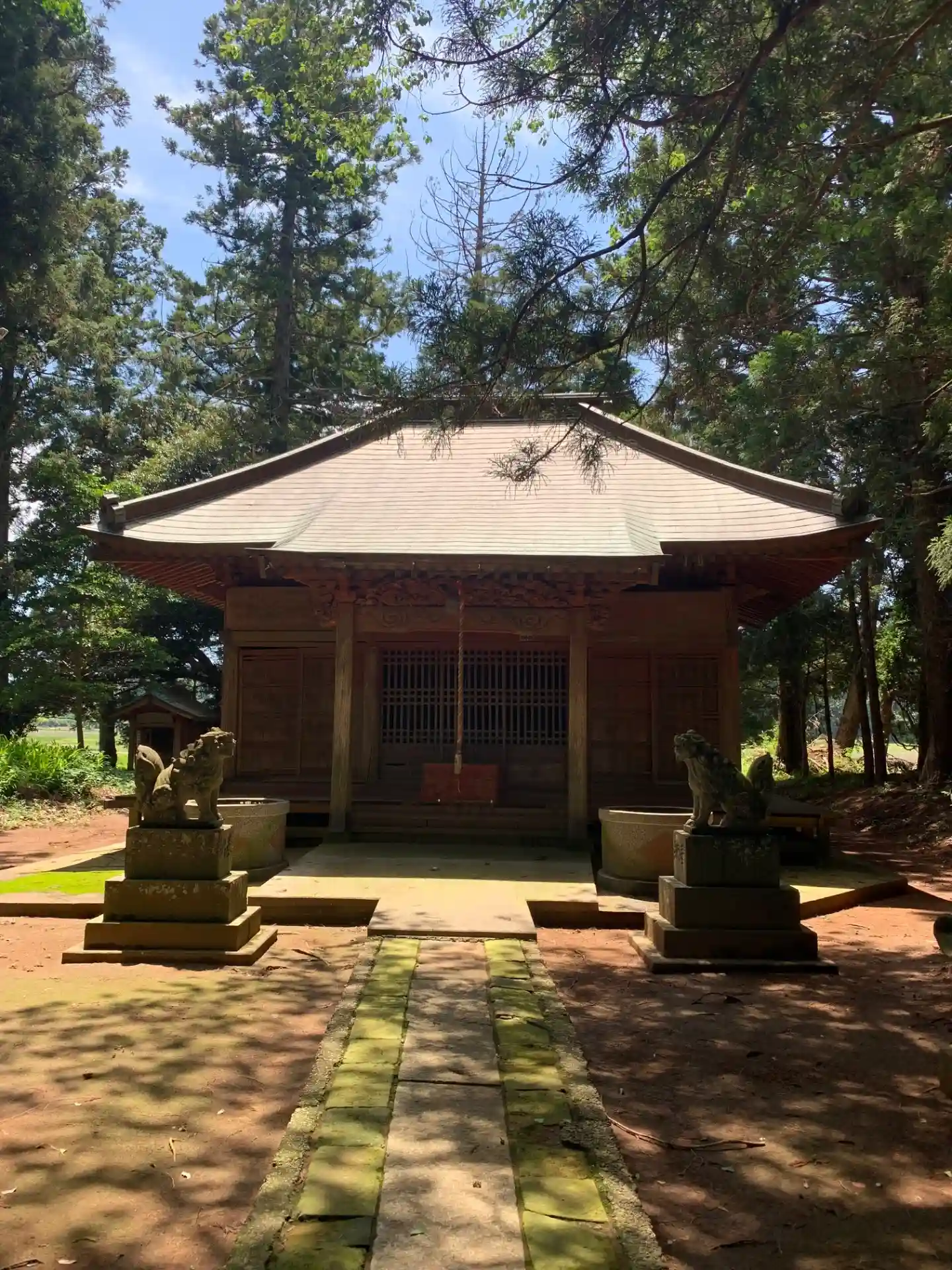 川島地区のY字路にある大きめの神社。宝珠型の立派な狛犬を備え、龍の彫刻も素晴らしいです。羽子板のような板に巻物をくっつけた謎のオブジェクトがありました。