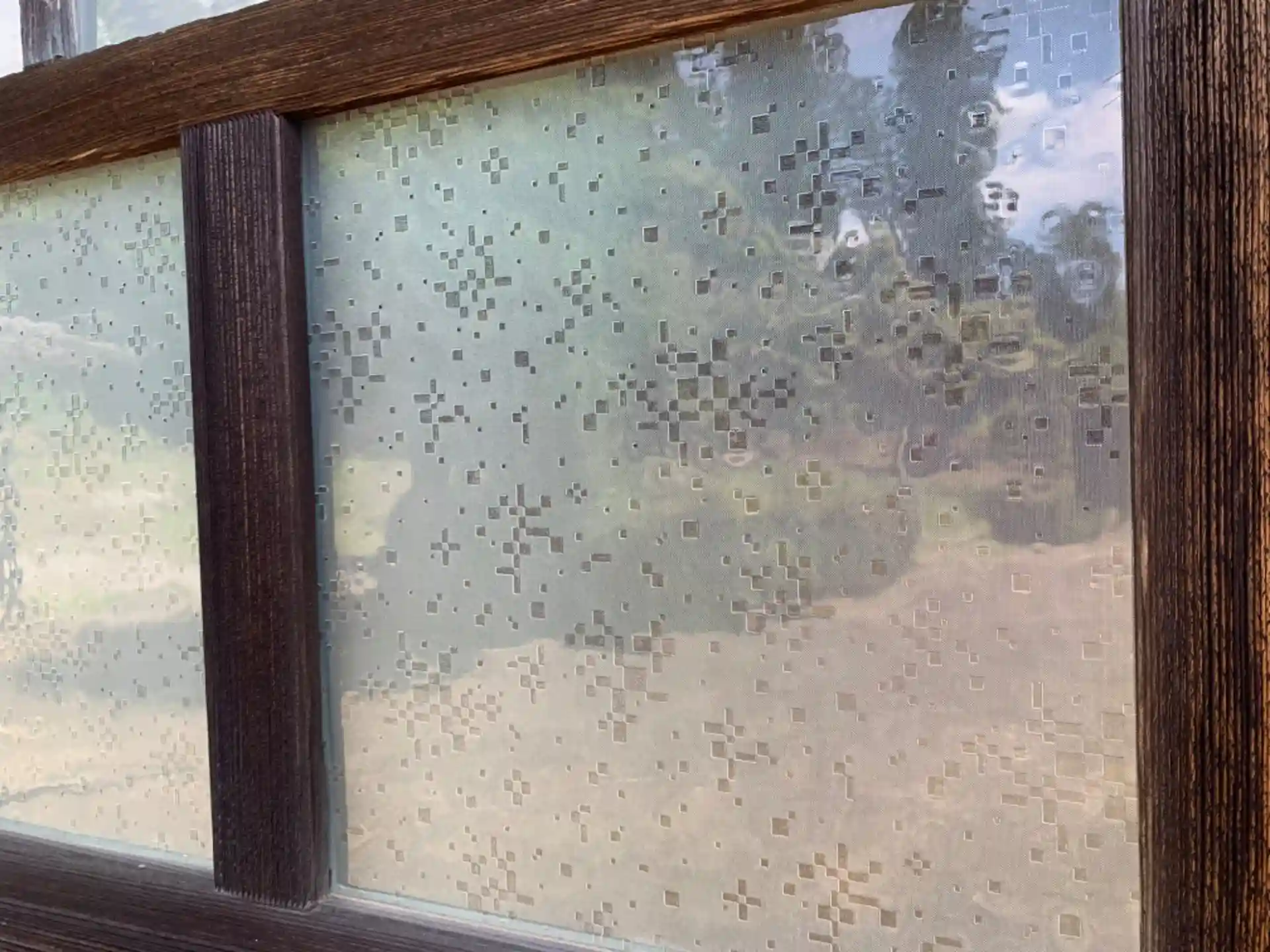 日蓮宗のお寺。ドット絵みたいな飾りガラス(「こと」という名前の模様だそう)がきれいです。