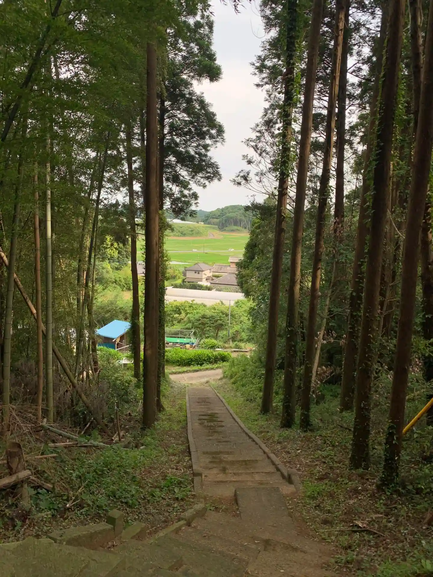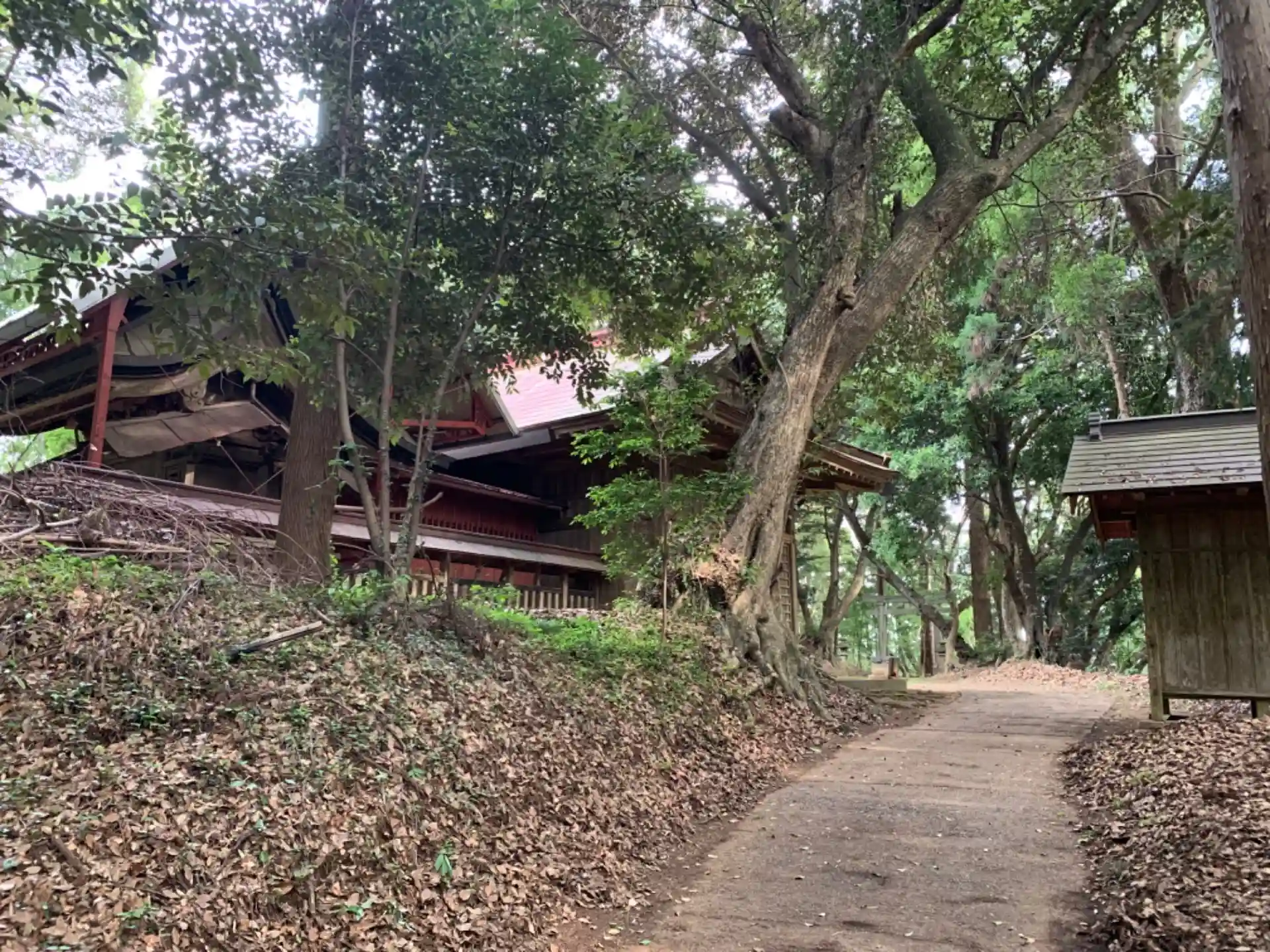 林道沿いの神社。杉林に赤い鳥居と社殿の屋根がよく映えます。