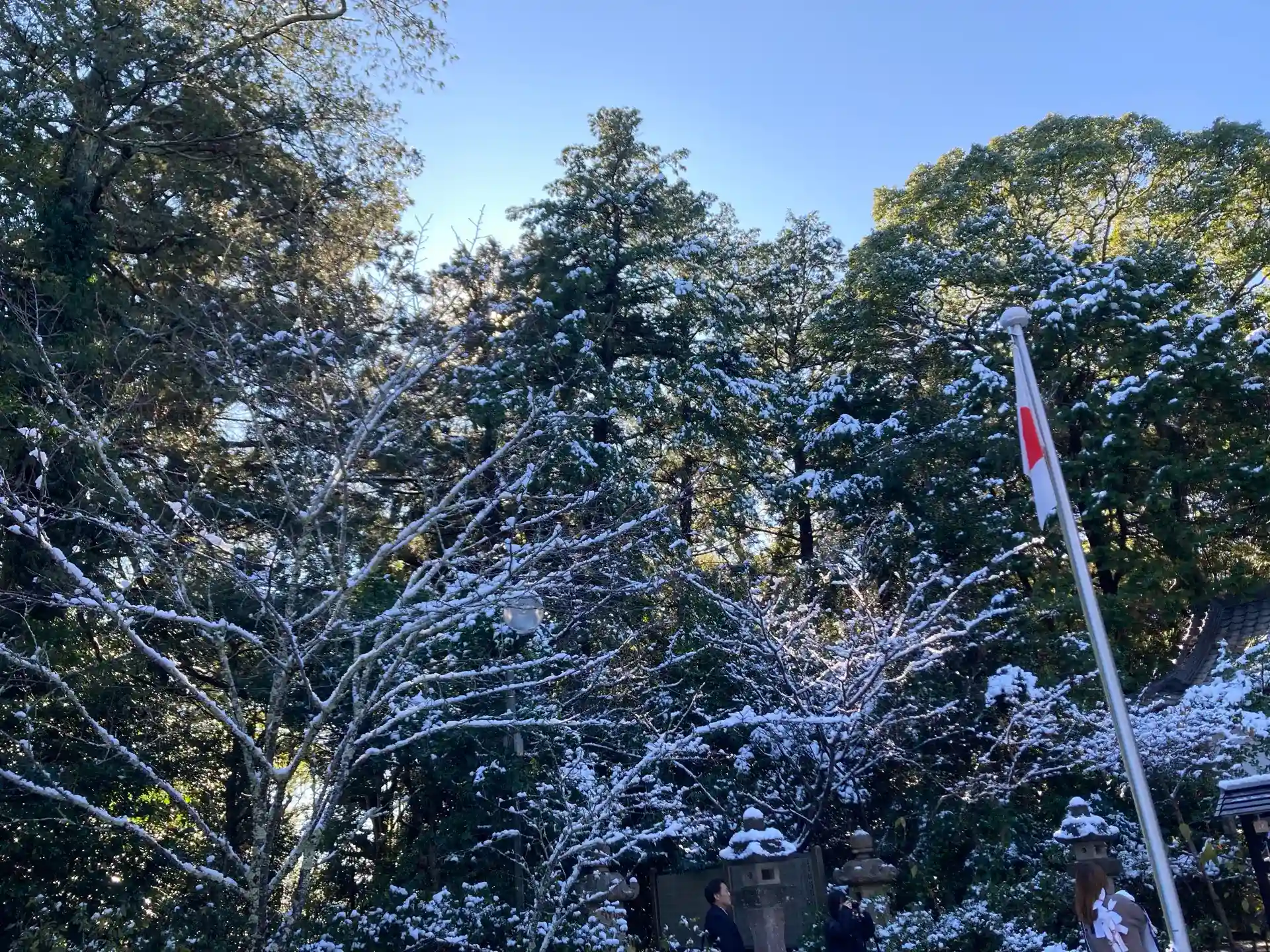 この地域はあまり雪が降らないため、雪景色の神社への参拝はとても珍しいです。