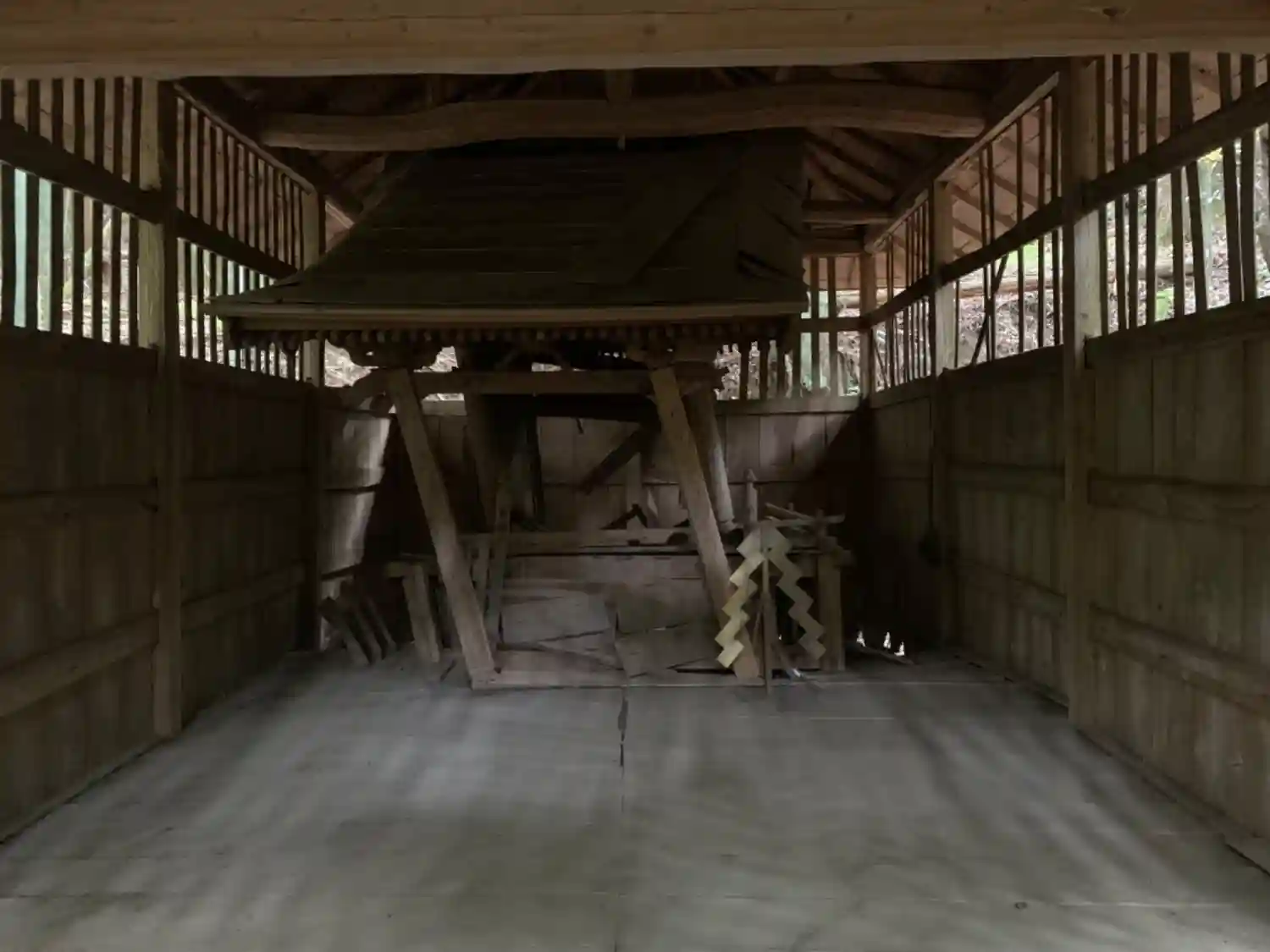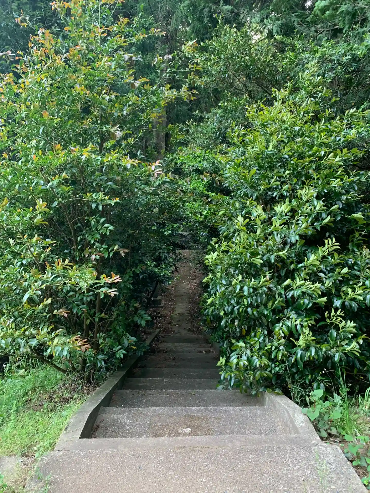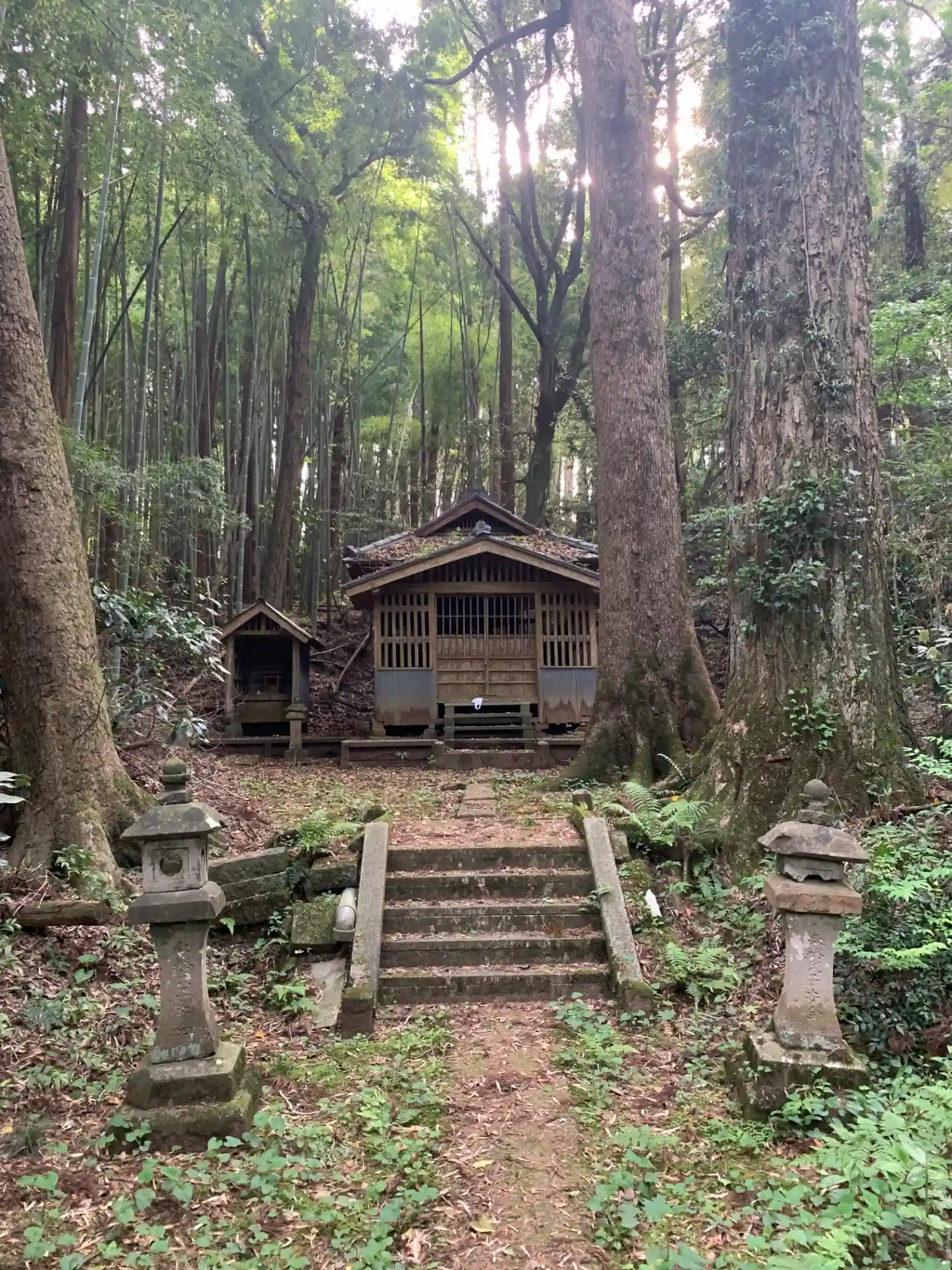 参道が下り階段という珍しい神社。常緑樹が茂っており鳥居を見つけづらいです。社殿を覗き込んでみると本…