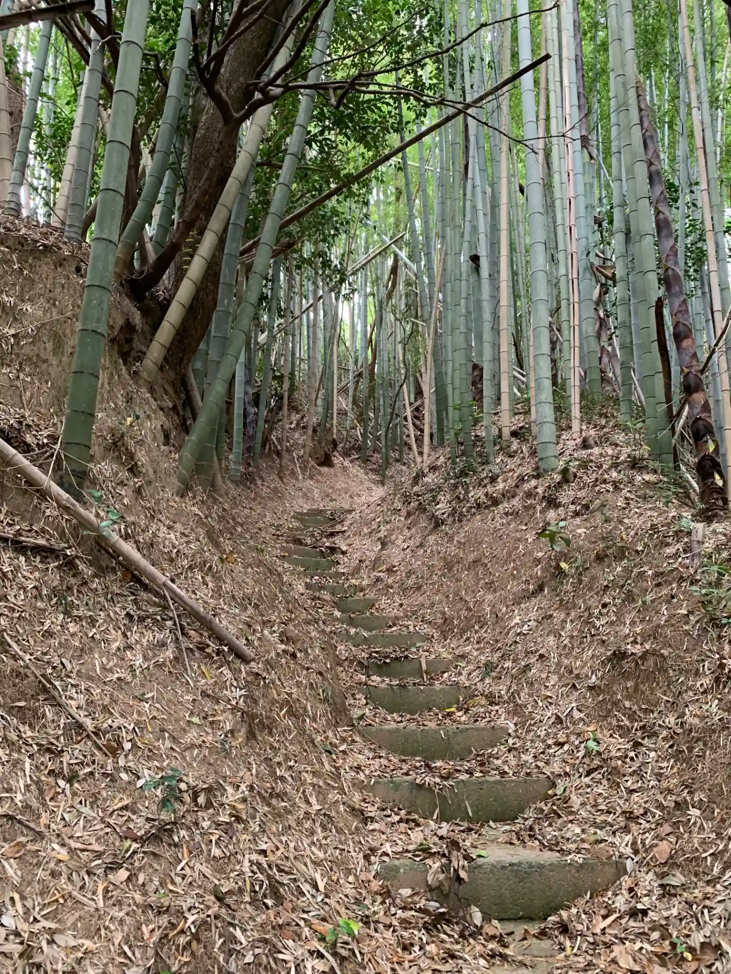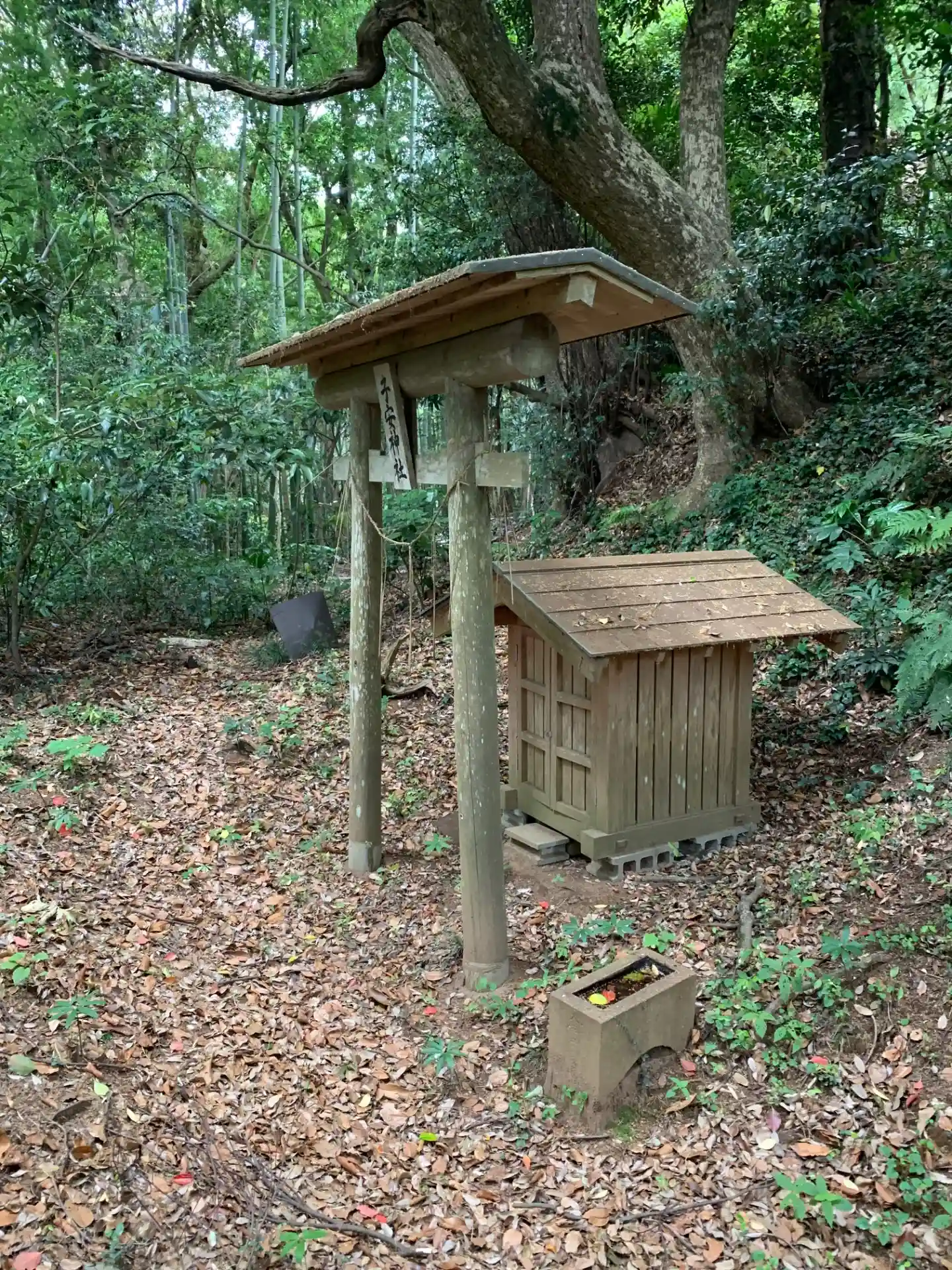 民家へ入る途中の廃倉庫脇に山へ入る道があります。急な階段を登ると尾根に出て、奥へ進むと子安神社祠と…