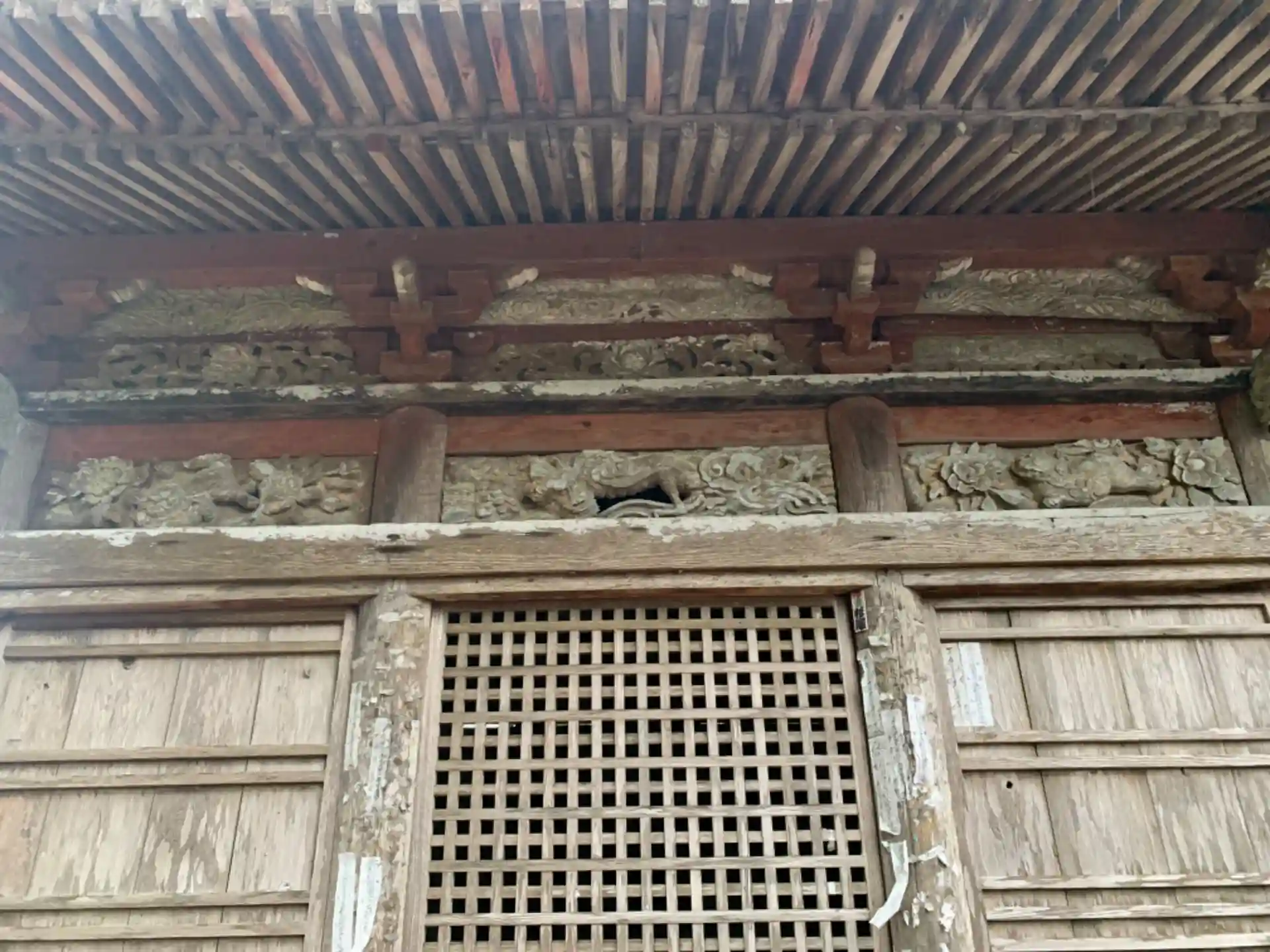 街道沿いのお寺。江戸時代のものと思われるお堂には龍と獅子の彫刻が飾られています。