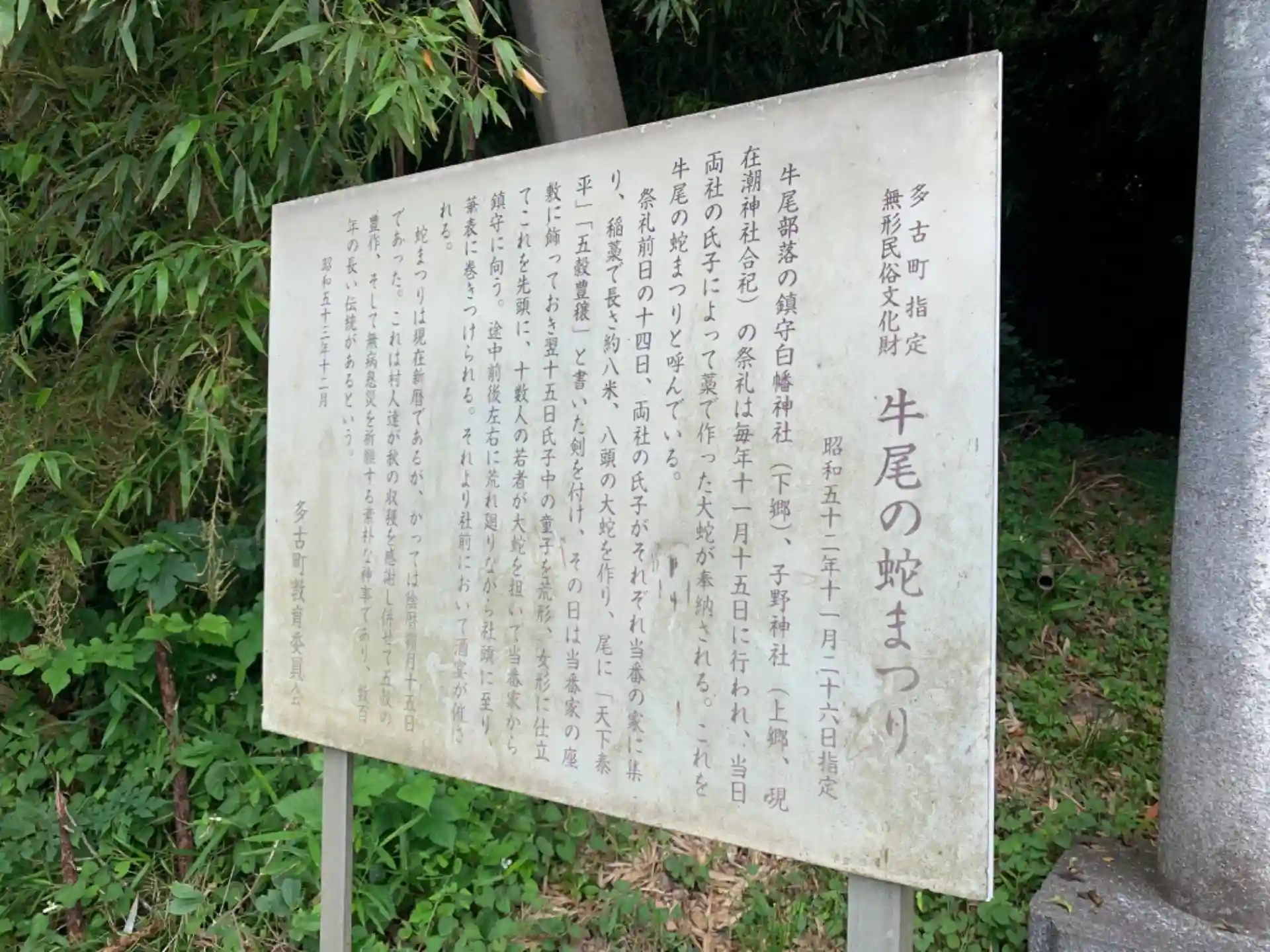 藁で作った大蛇が奉納される神社。この大蛇を担いで豊穣と無病息災を願うそうです。下から覗き込むと大きい目に大きい鼻をつけたコミカルな顔を見ることができました。