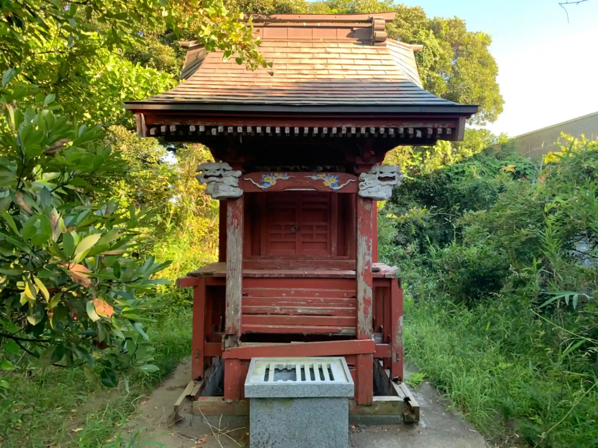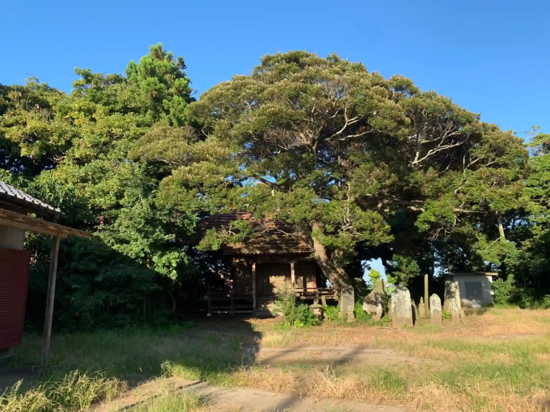 小学校と保育園の隙間にあるお堂。弁財天や集会所が付近にあります。お堂のそばの大木の周りには様々な巡礼記念碑が並んでいました。
