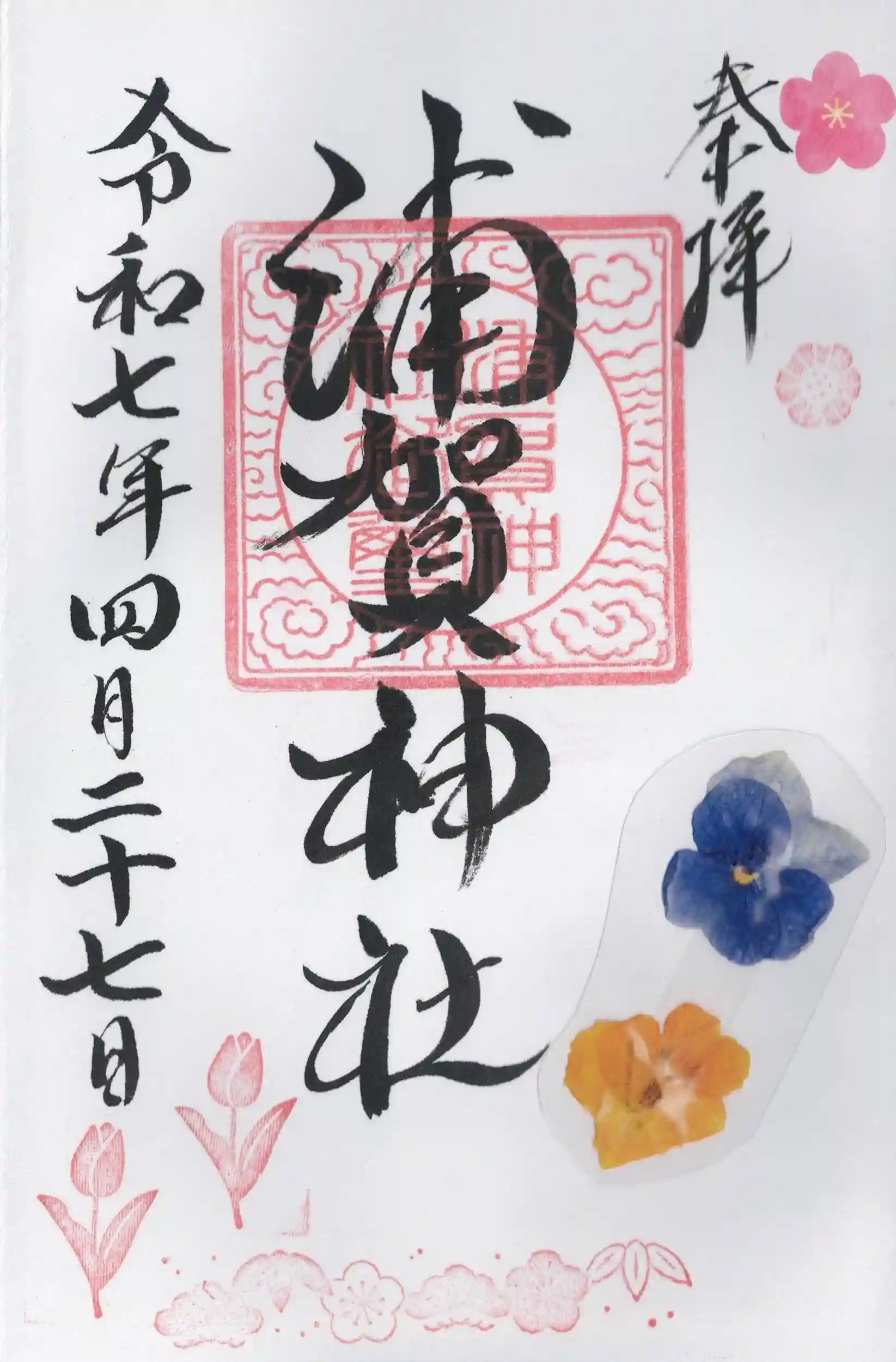 御朱印には、押し花が貼り付けされ、拝殿に奉納されたお花があれば頂くことができると伺っていた通りでした。