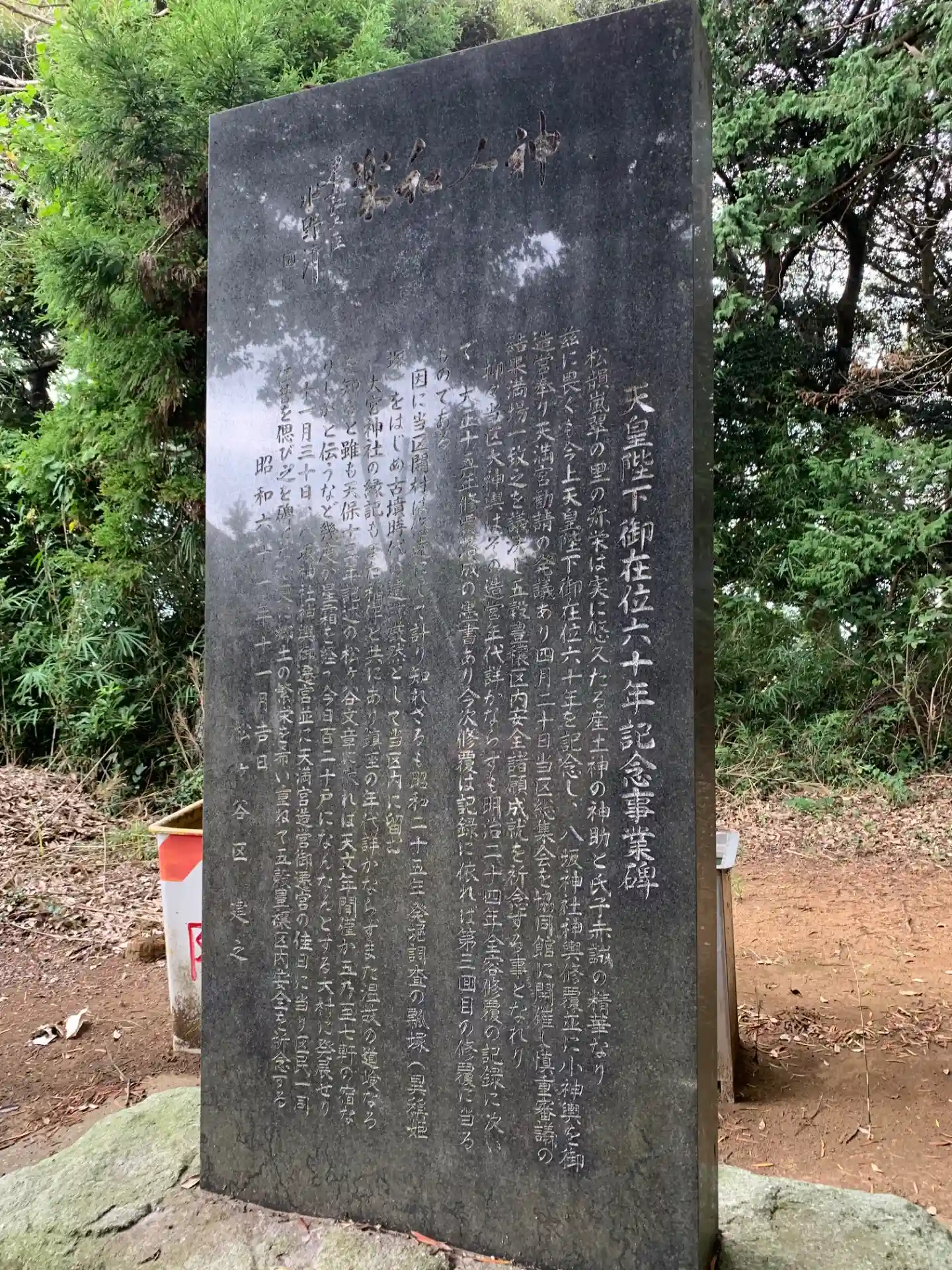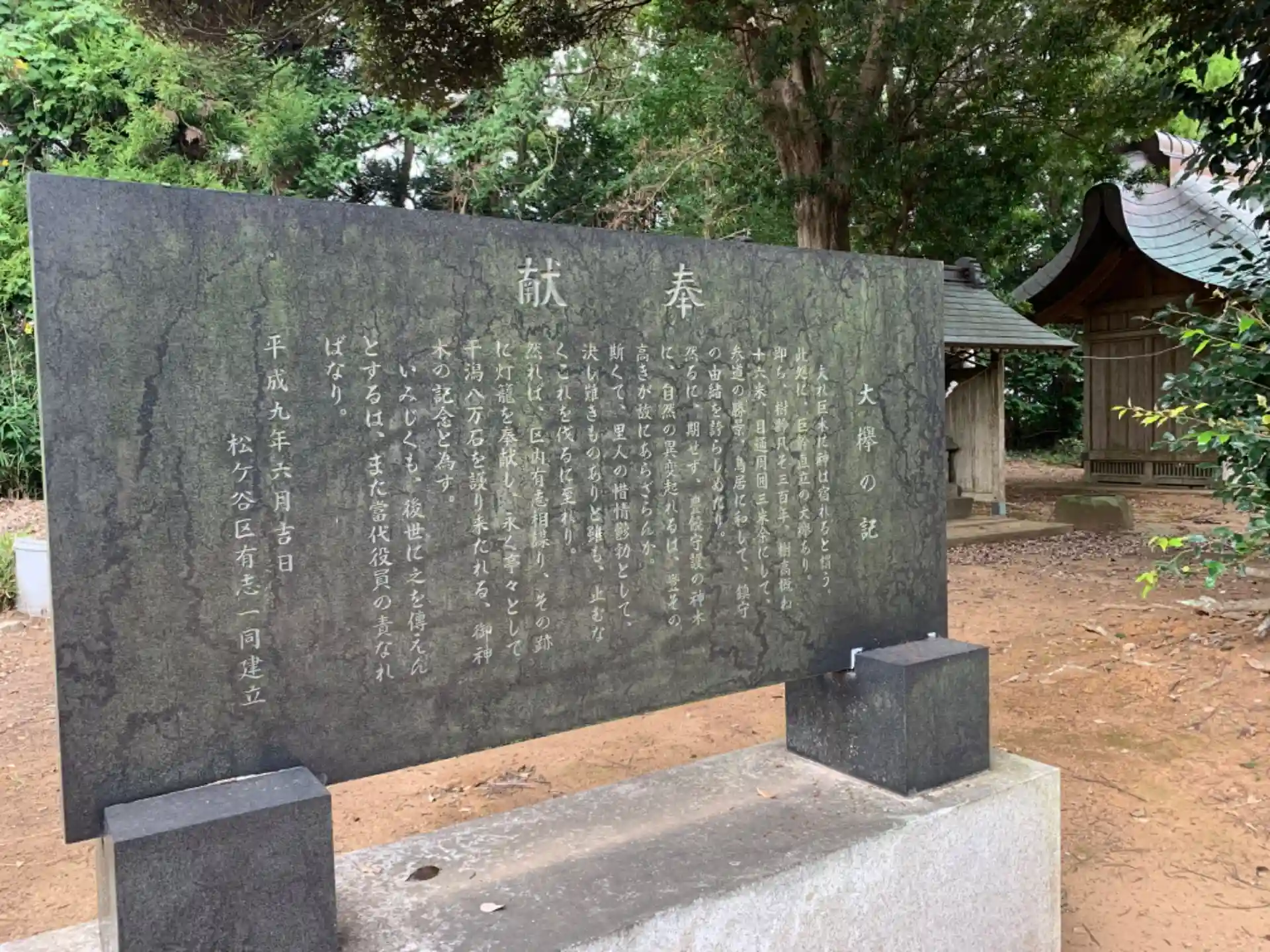 民家の裏手にある神社。樹齢300年の大欅があったことを示す石碑があります。