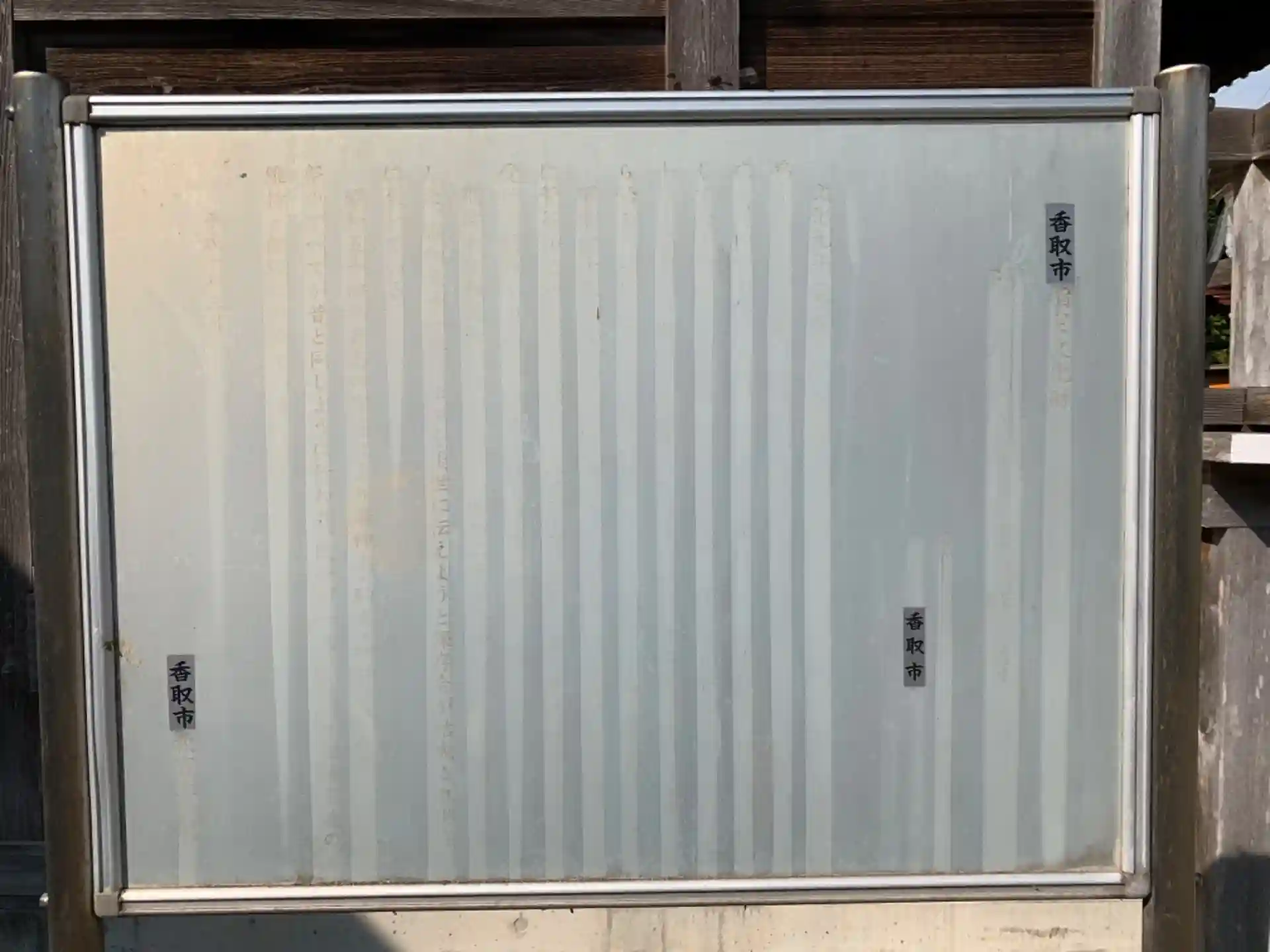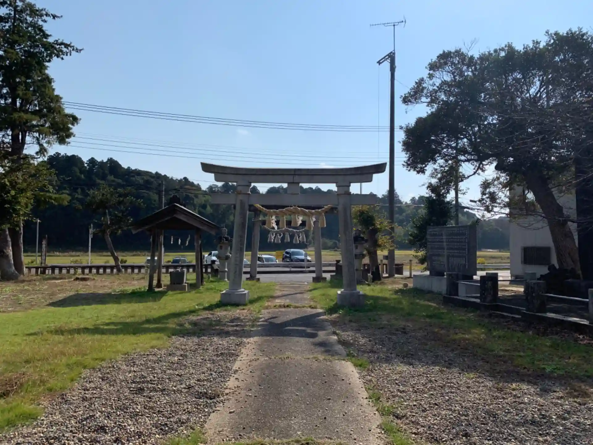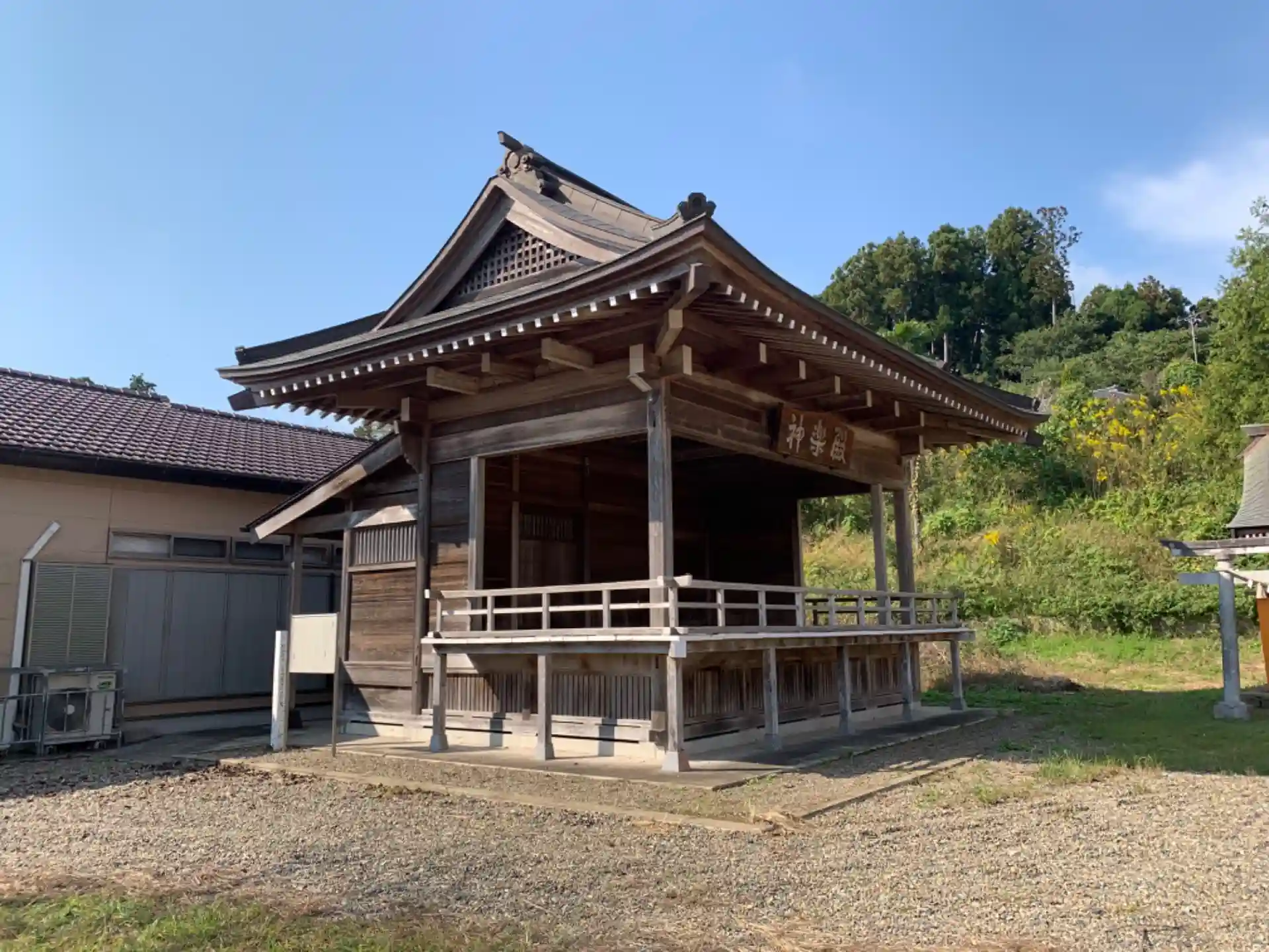 よく整備された砂利敷きの神社。立派な神楽殿がありますが自治体が設置した神楽の説明と思われる看板は完全に風化していました。