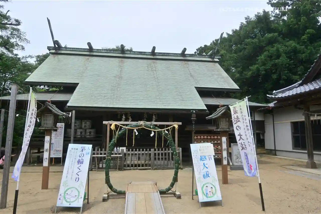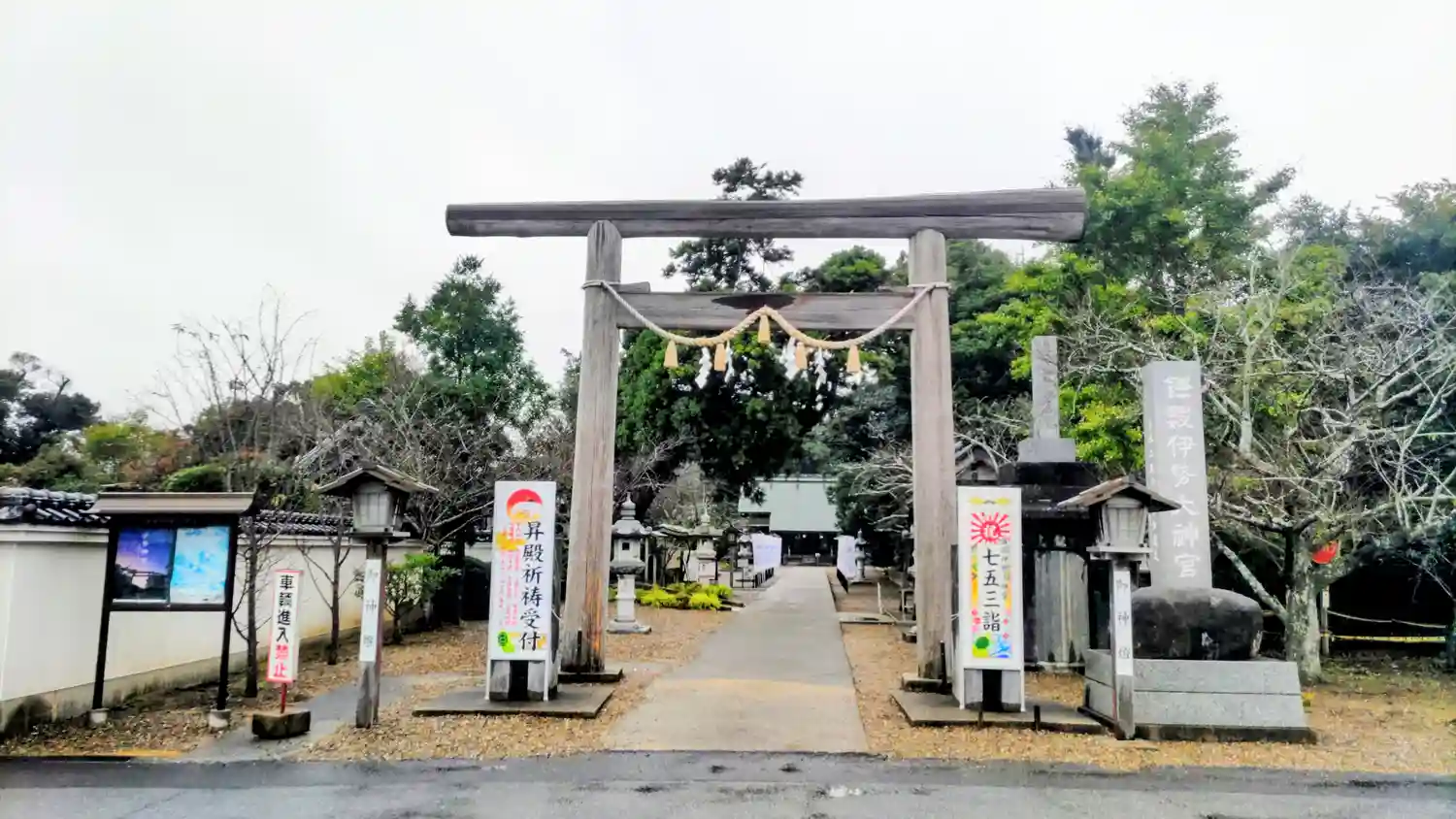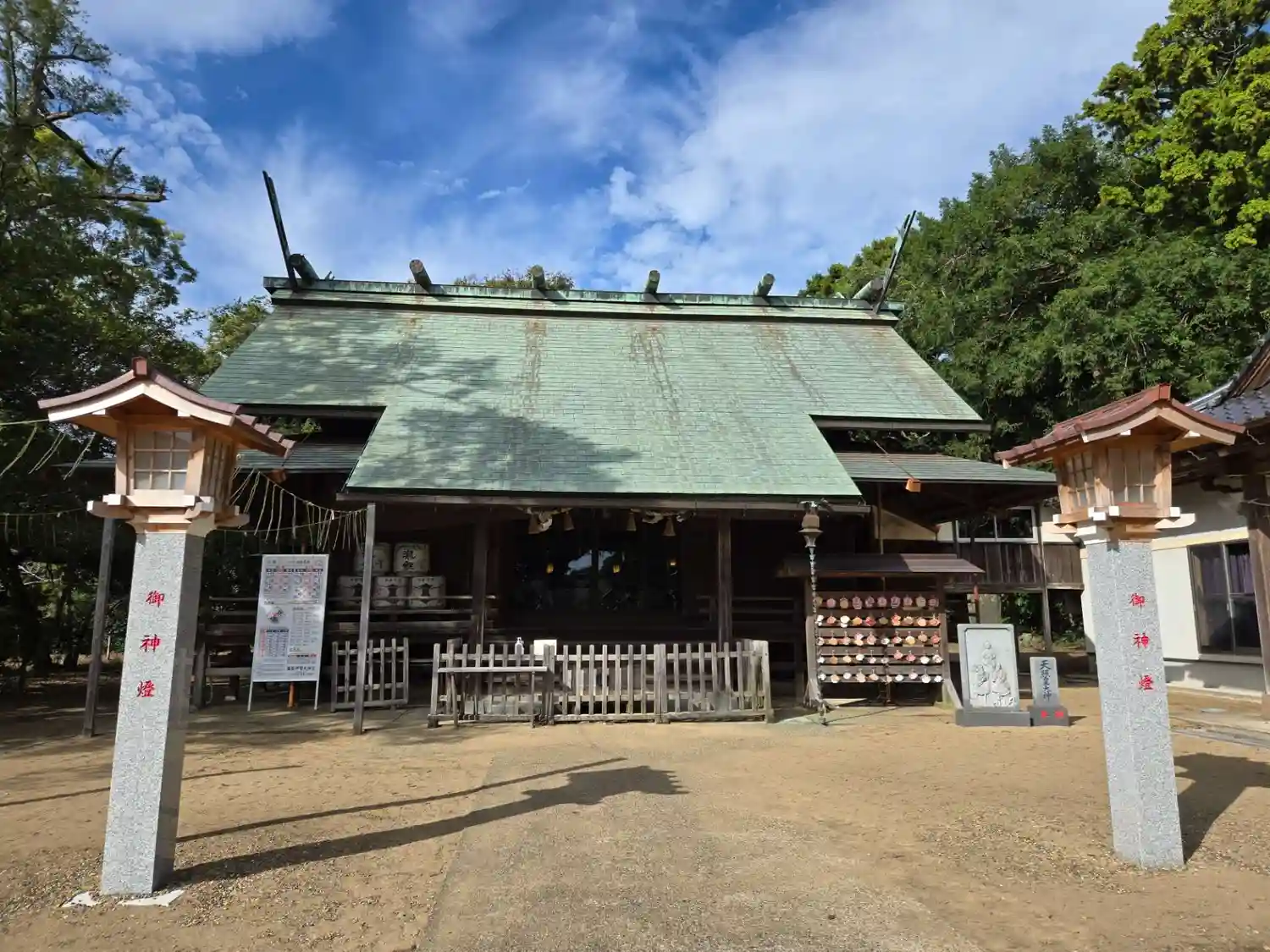 正面鳥居の前に駐車場があるほか、神社左手に大きな駐車場があります。