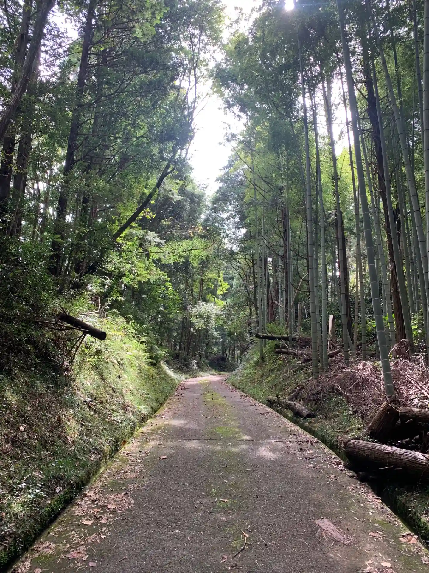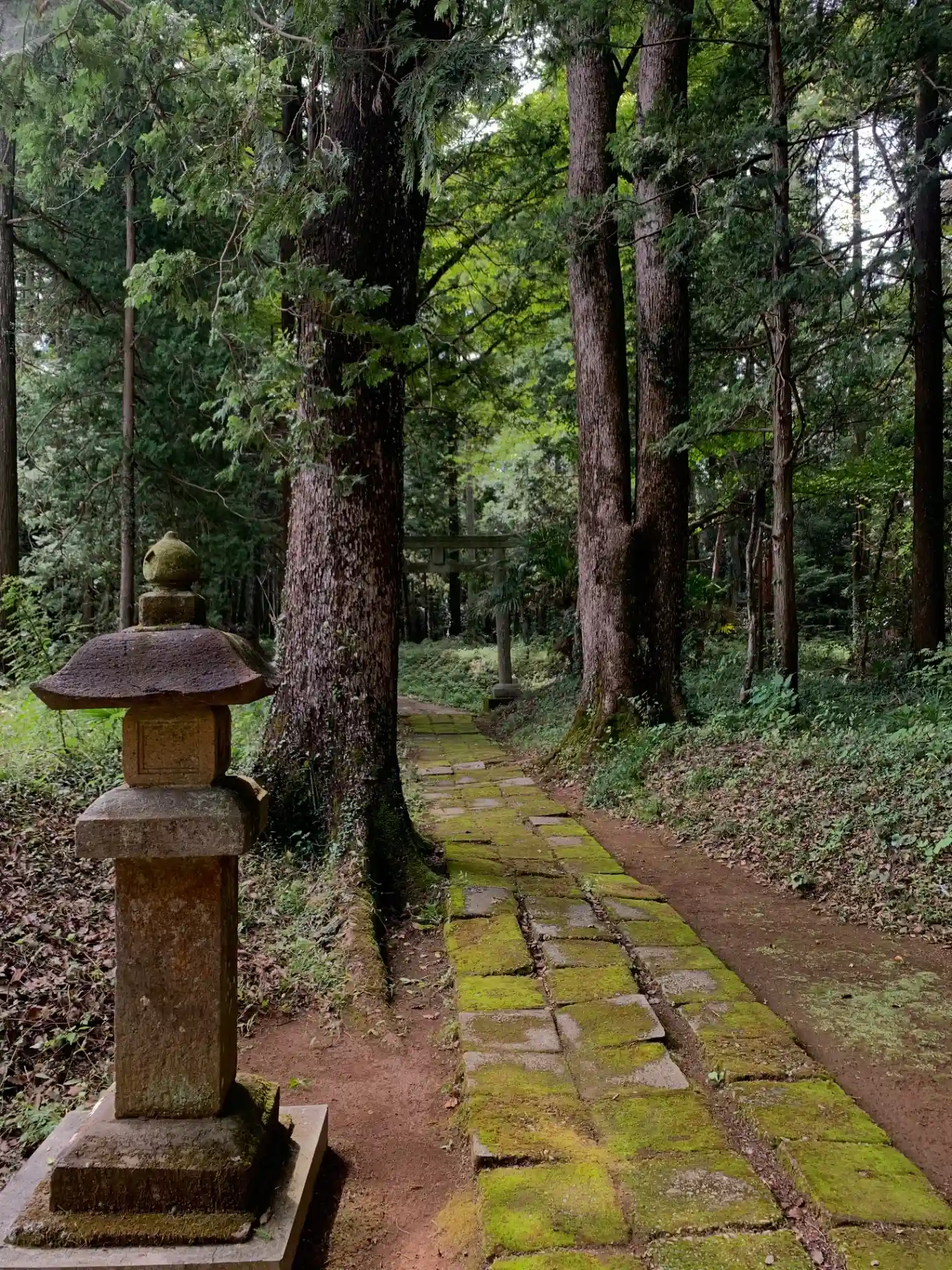 林道の途中にある神社。杉林の中にあり、苔むした石畳が素敵な雰囲気でした。本堂が市指定文化財とのこと。