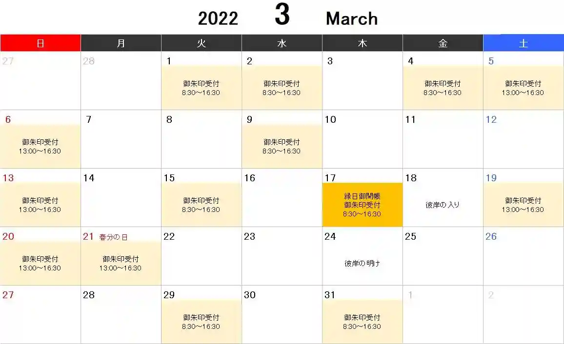 御朱印帳に直接浄書致します。住職が法要中・不在の場合は書き置きにて対応させて頂きます。直接書き入れが対応可能な日程は下記の写真を参考にして下さい。尚、葬儀などで変更される場合もあります。