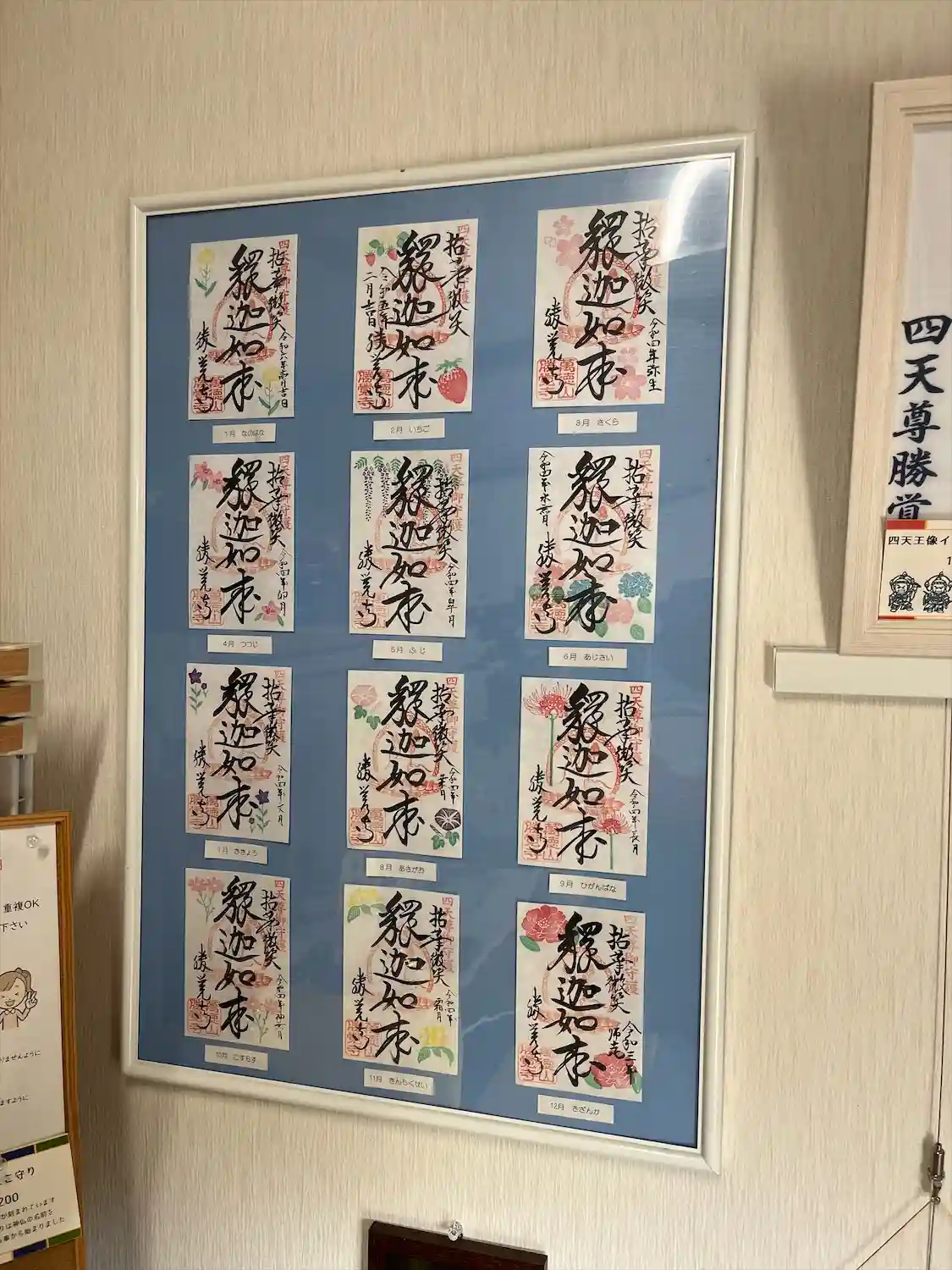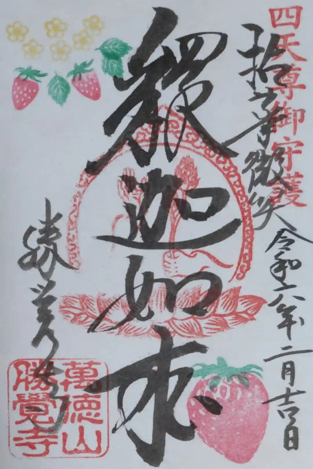 花を持ったお釈迦様にちなんで、花をデザインした月替わりの御朱印があります。 切り絵御朱印以外は、御朱印帳に直接浄書いたします。
