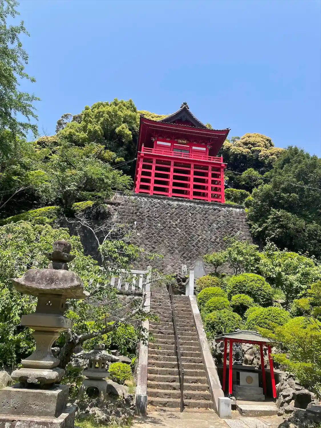 緑の丘を背負って立つ朱塗りの本堂が、