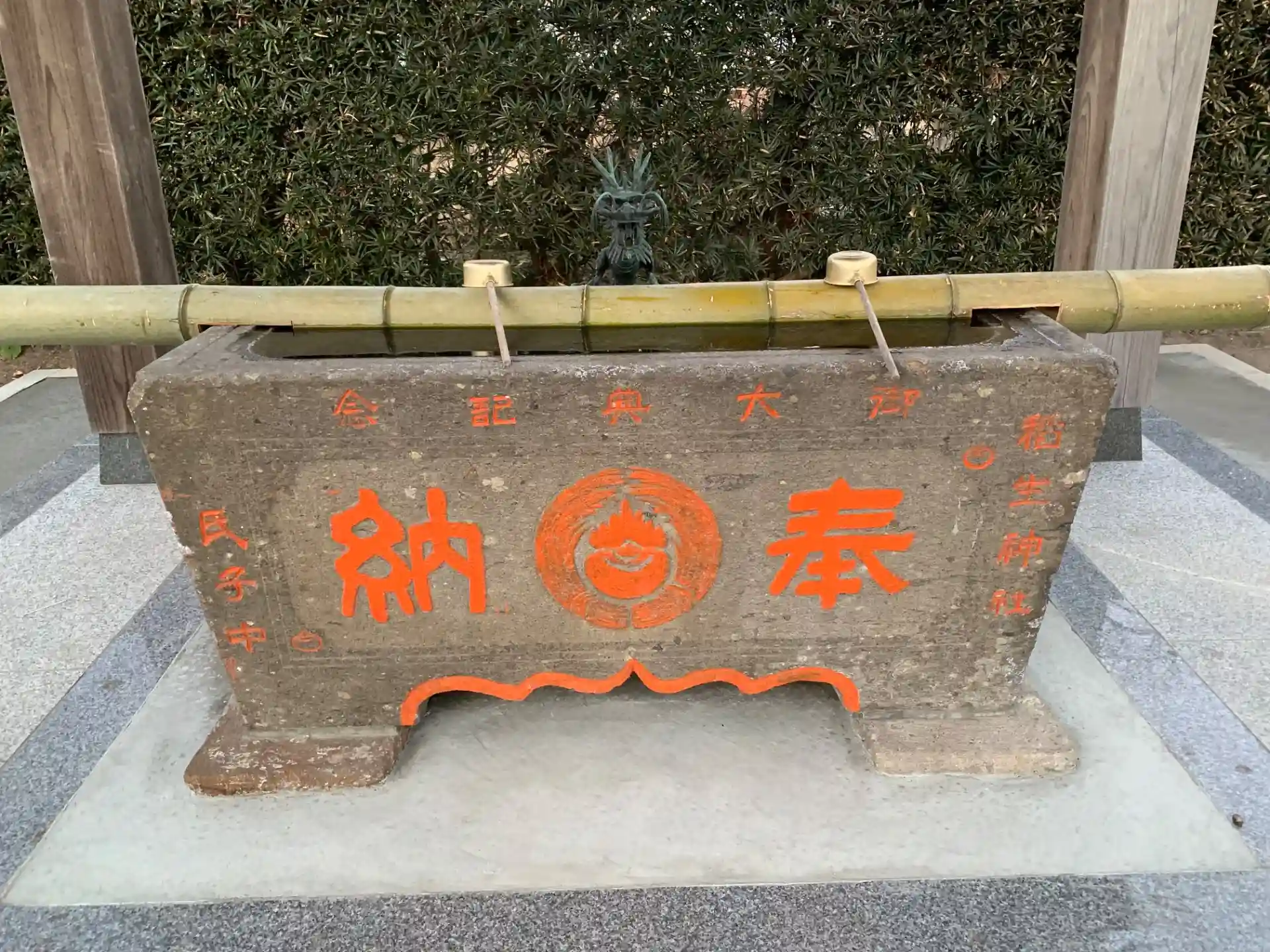 比較的大きめの稲生神社が近隣にもあります。茅の輪くぐりをやっていたようでした。真っ赤に塗られた彫刻は後藤傳吉郎住兼のもの。二体の龍が向き合っています。