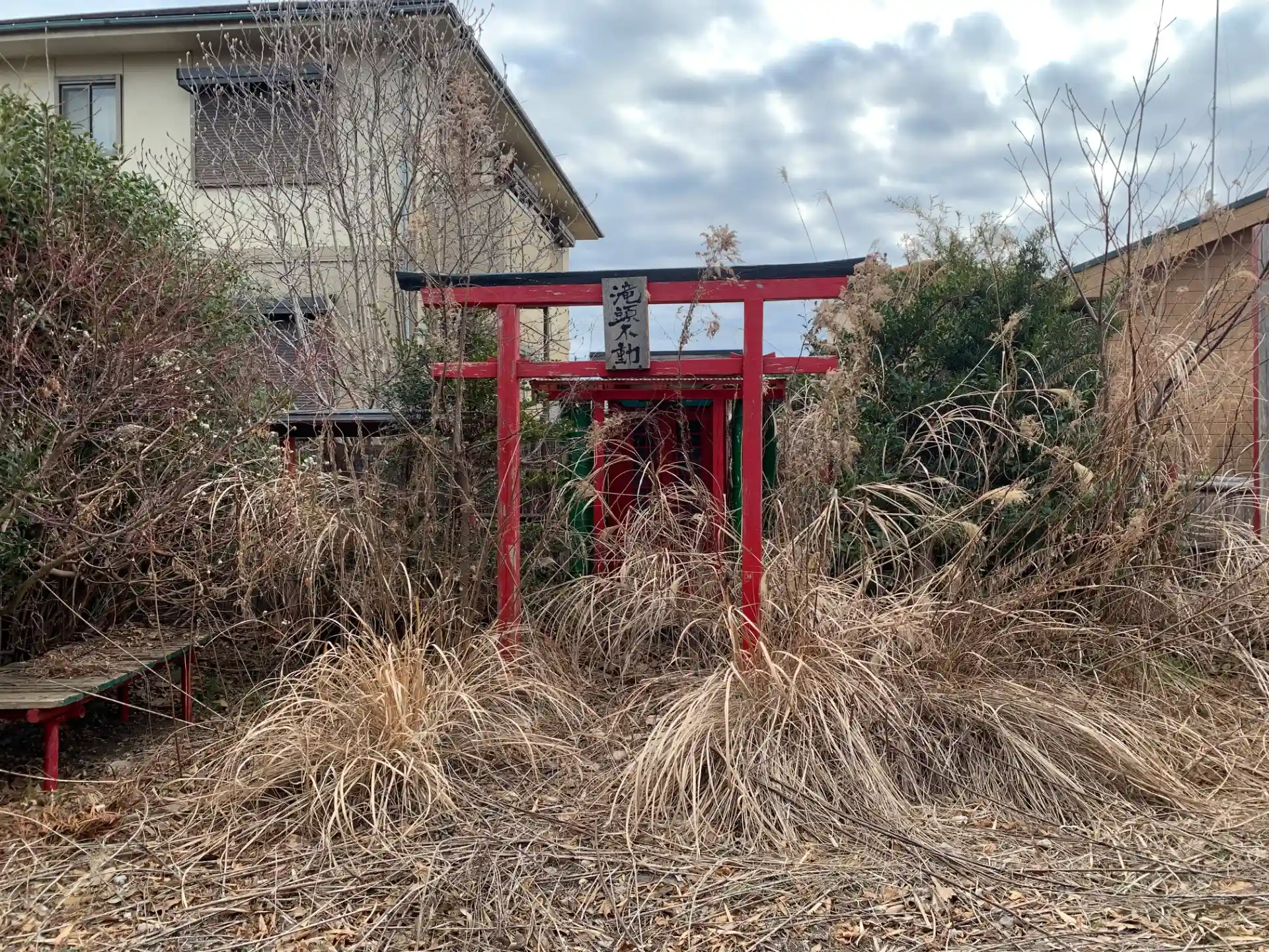 分譲地の一区画にある祠。Googleマップの5年前の投稿と比べてだいぶ荒れています。