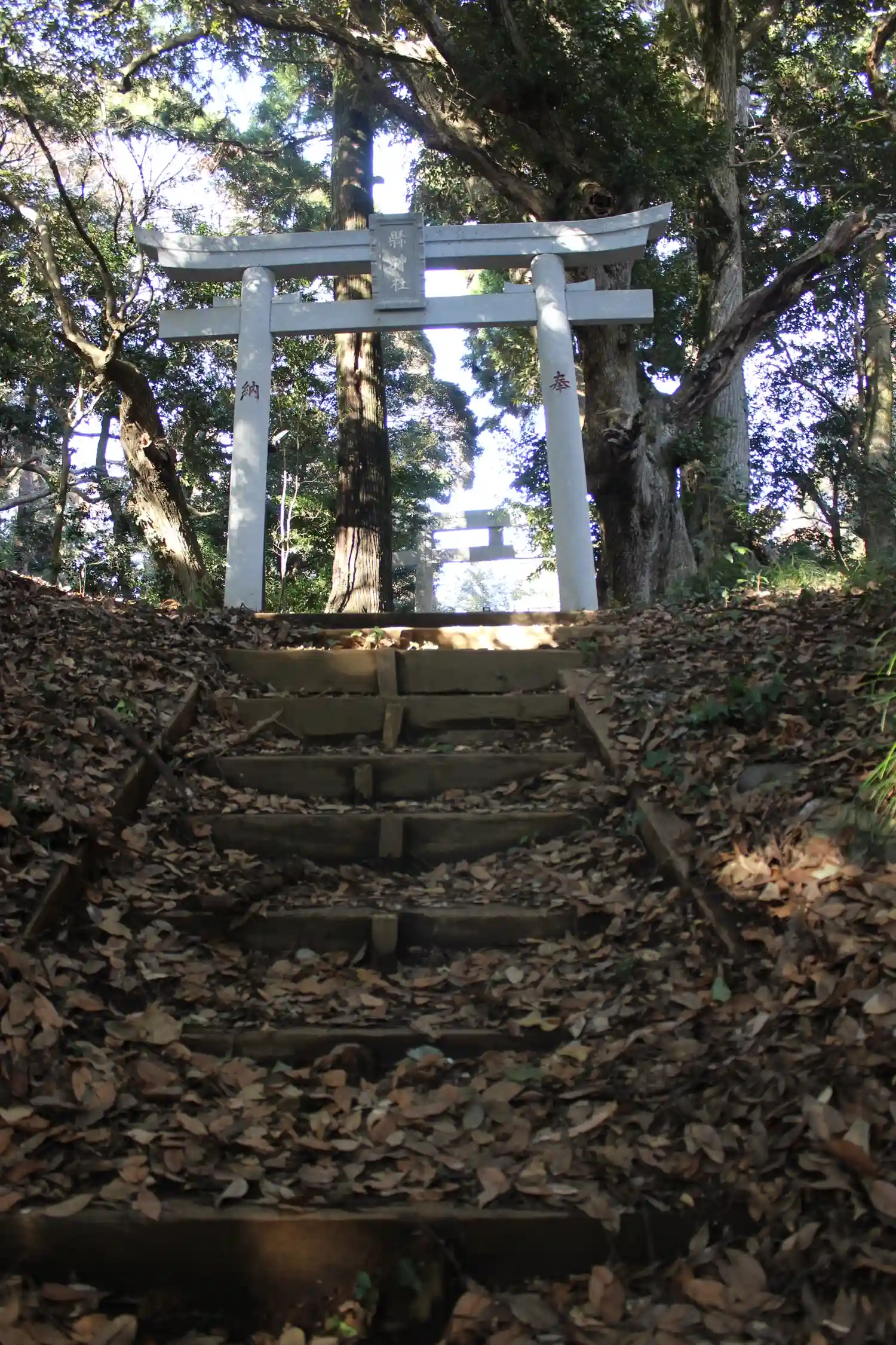 山頂に社が有りました。山頂近くの駐車場に停めれば、森の中の裏参道を歩いて近いです。二の鳥居の正面か…
