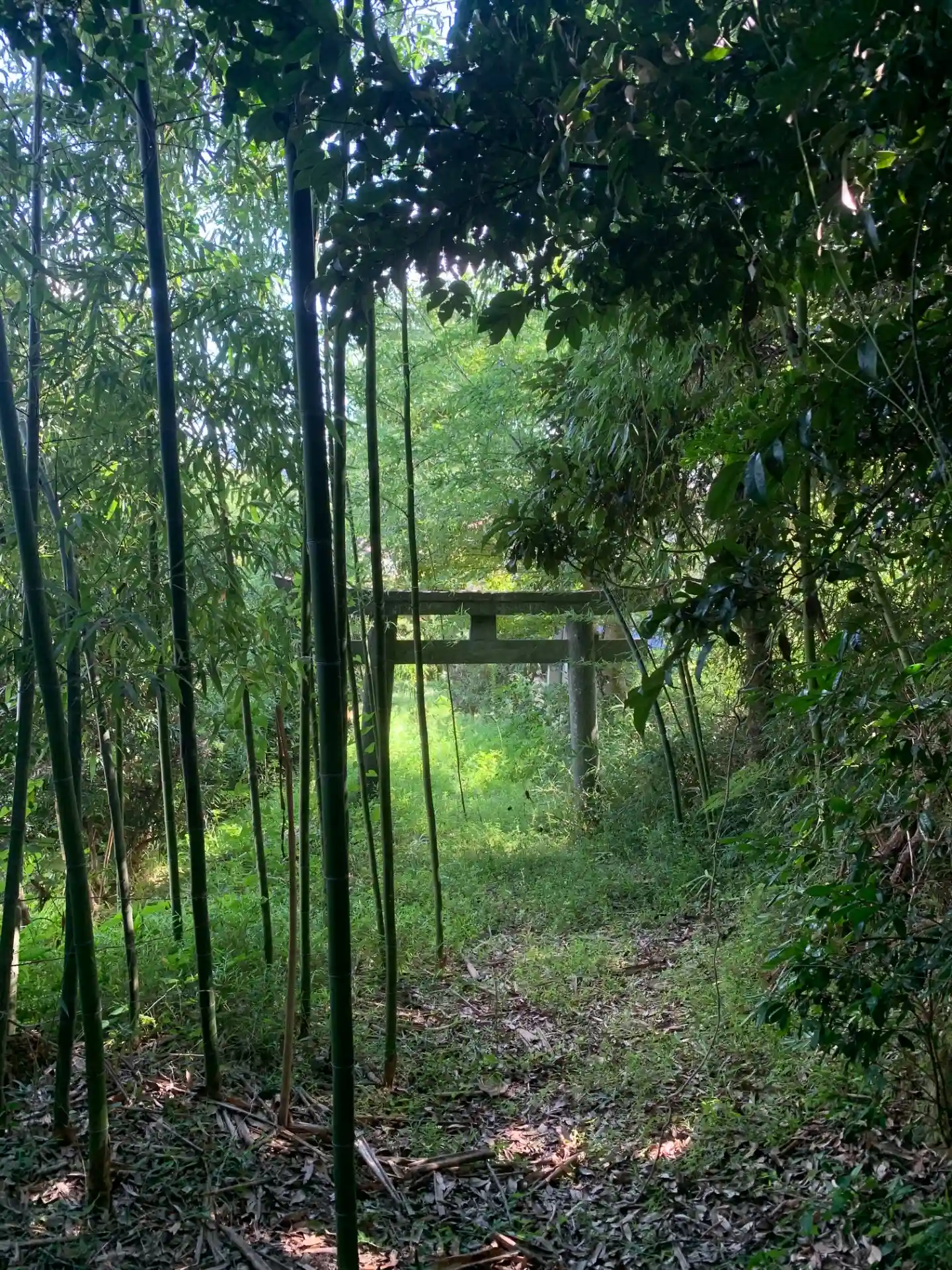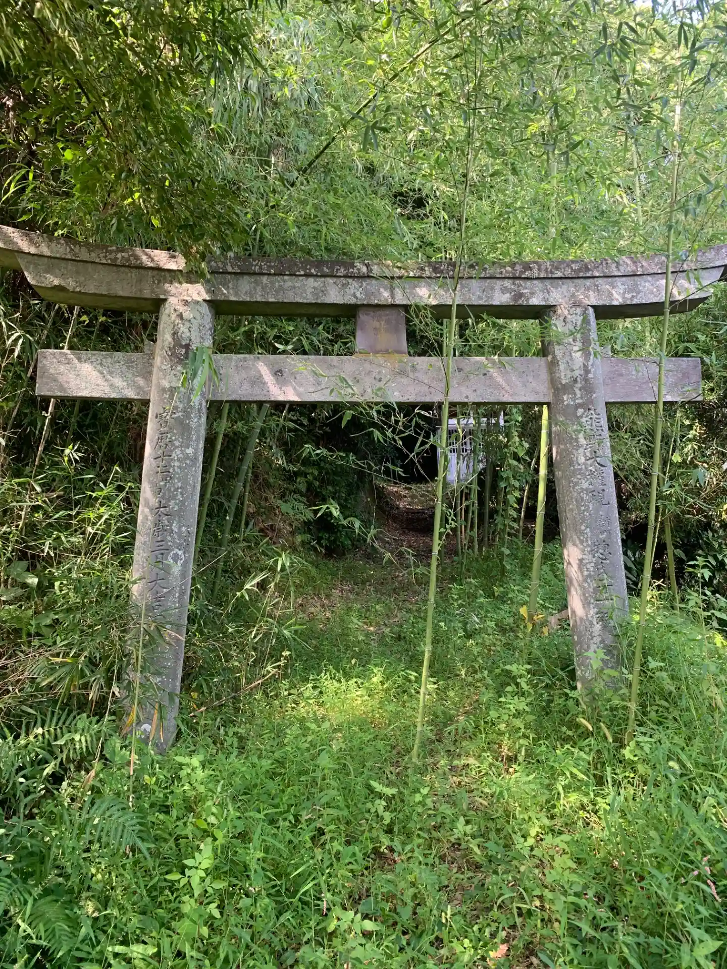 工場脇の駐車場に入口があります。鳥居付近は草が茂っており、その奥は竹の侵食が始まっていました。