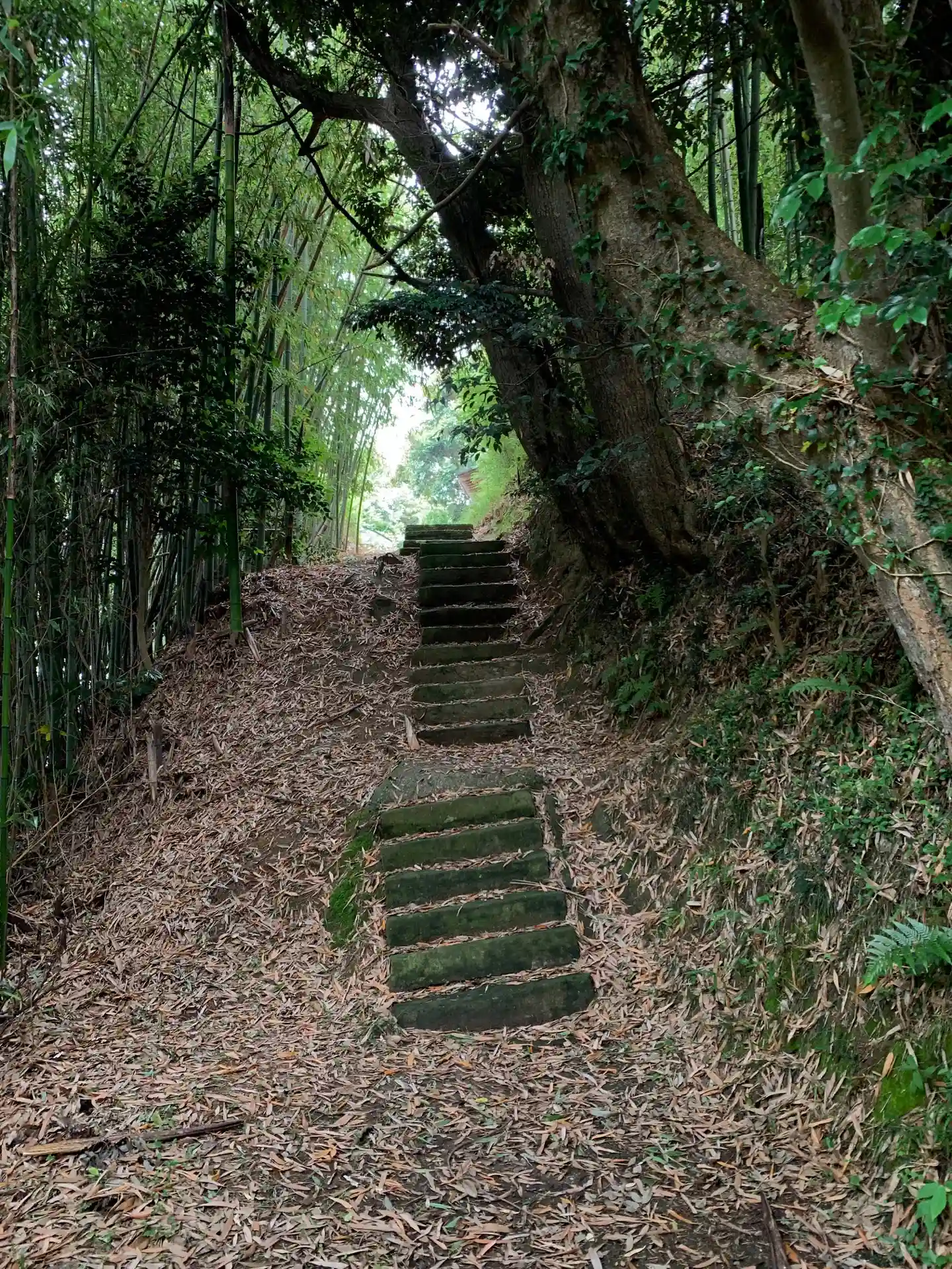 住宅地の一番奥に細い道があり、竹の葉っぱですごい滑る参道を登ると見晴らしのいい高台に出ます。