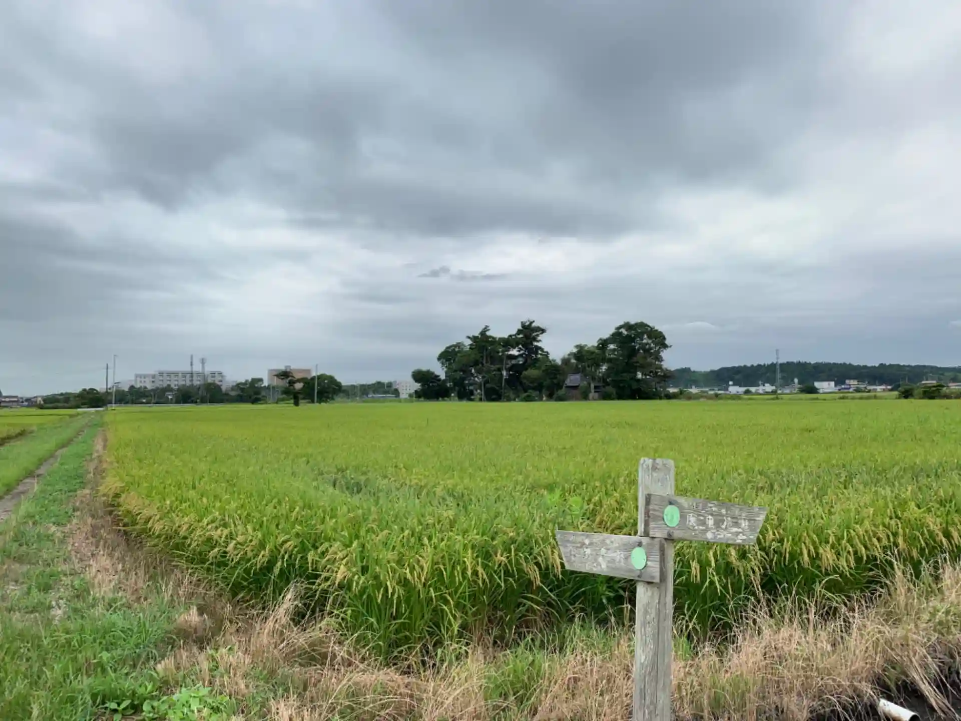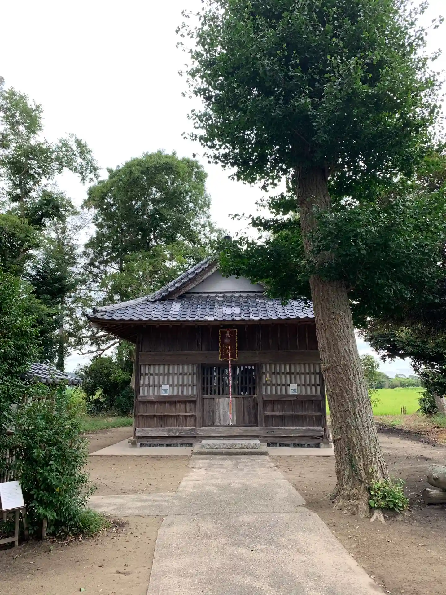 関東ふれあいの道の目的地の一つに指定されている神社。田んぼの中に小島のように建っており、境内にはひときわ立派な大杉が聳えています。境内には植えられた樹木に解説がついているなど地元の方が熱心に維持管理していることがわかります。