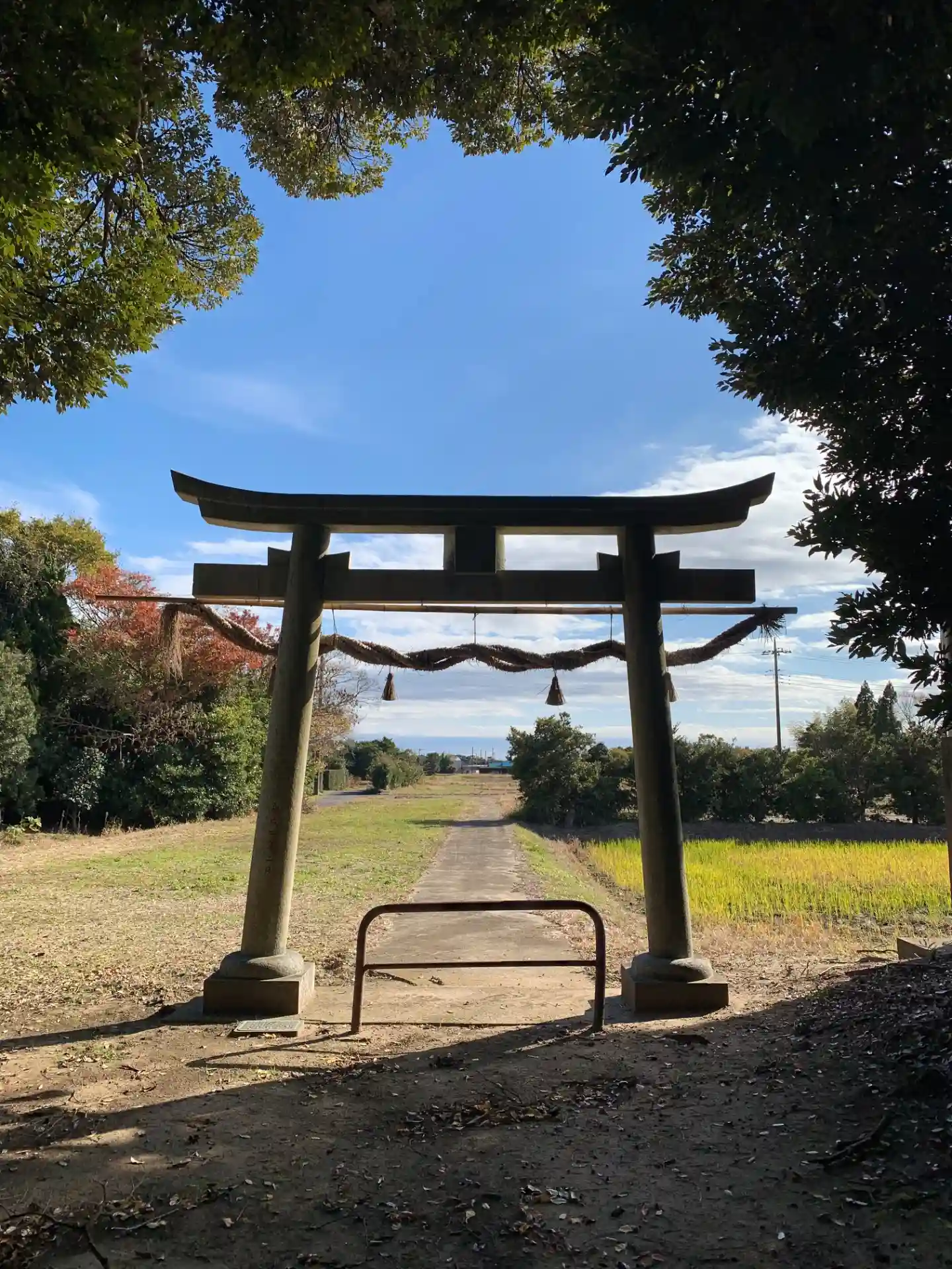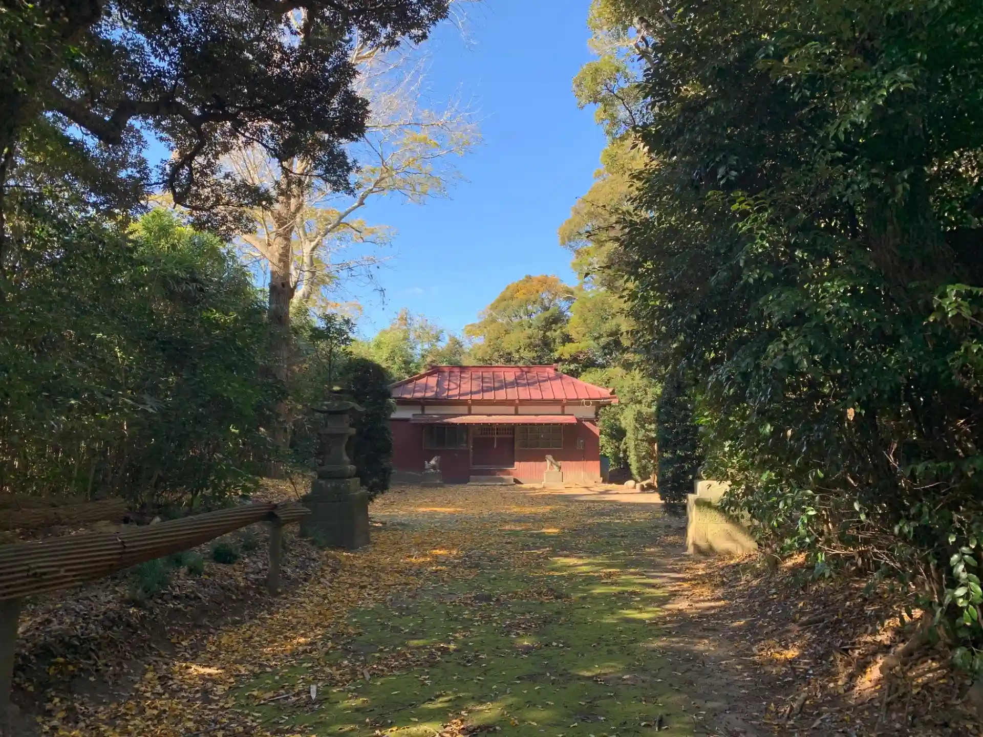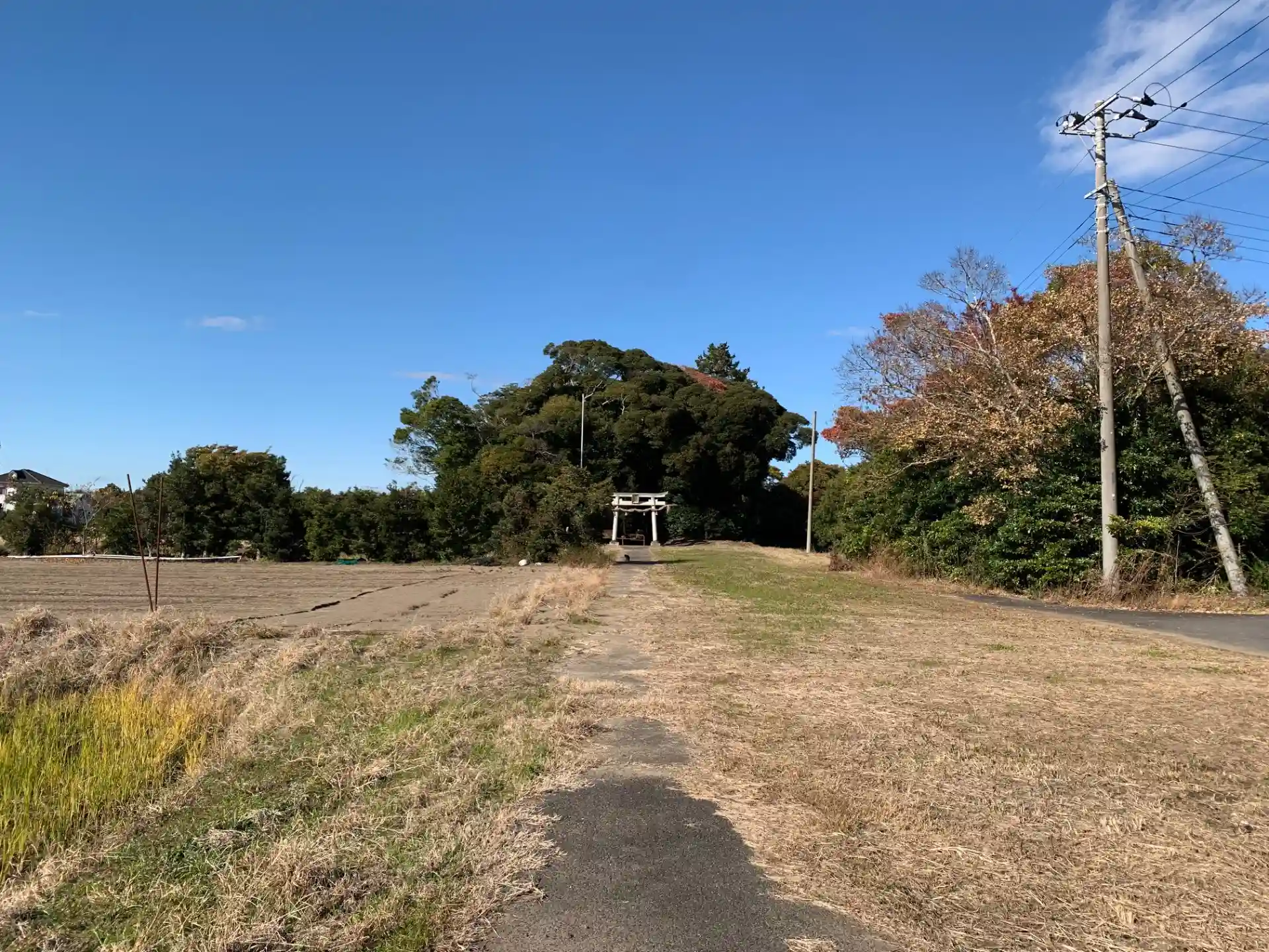 田んぼに浮かぶ森。こんもりした木々に囲まれて境内は苔むしていました。