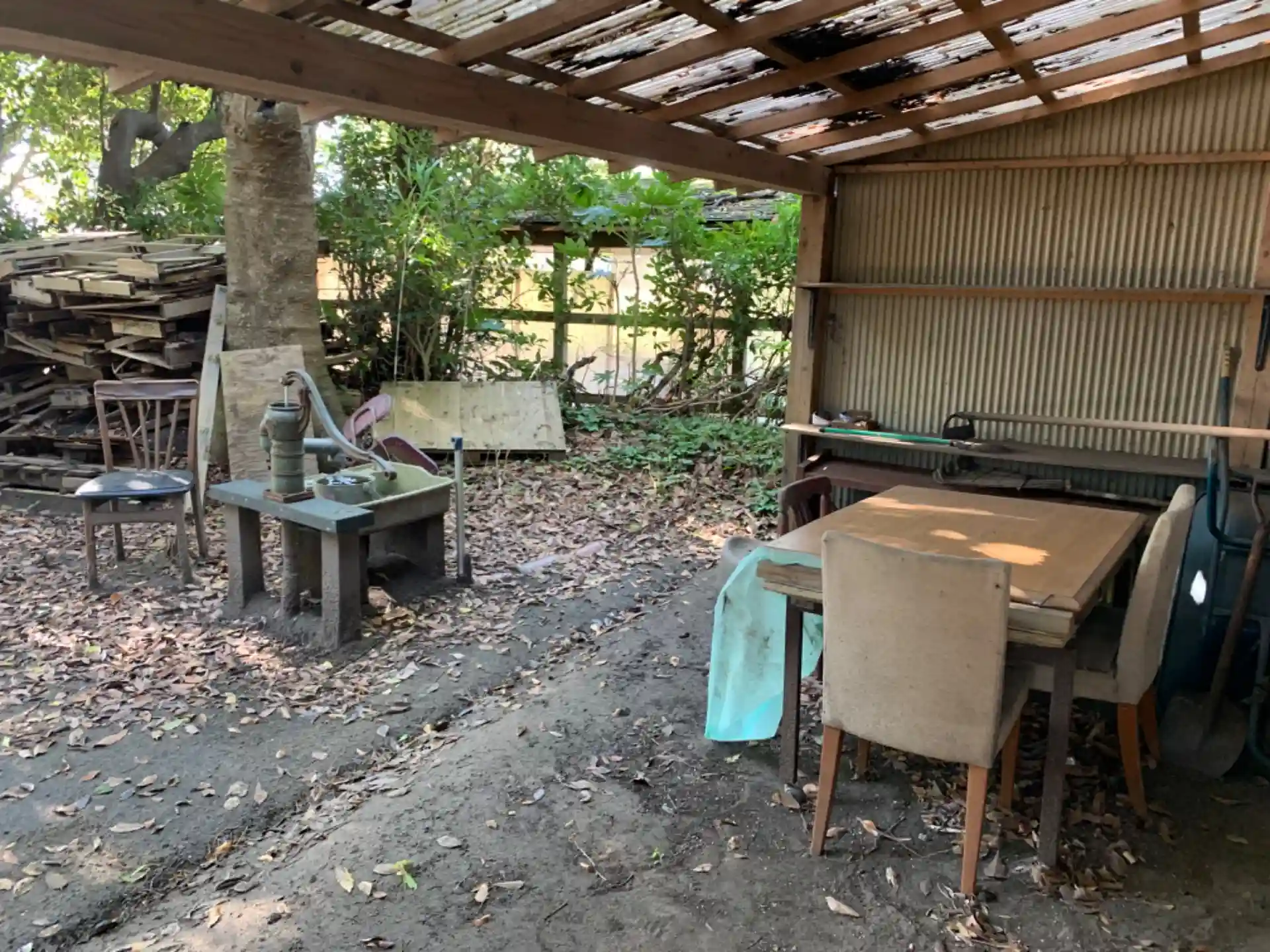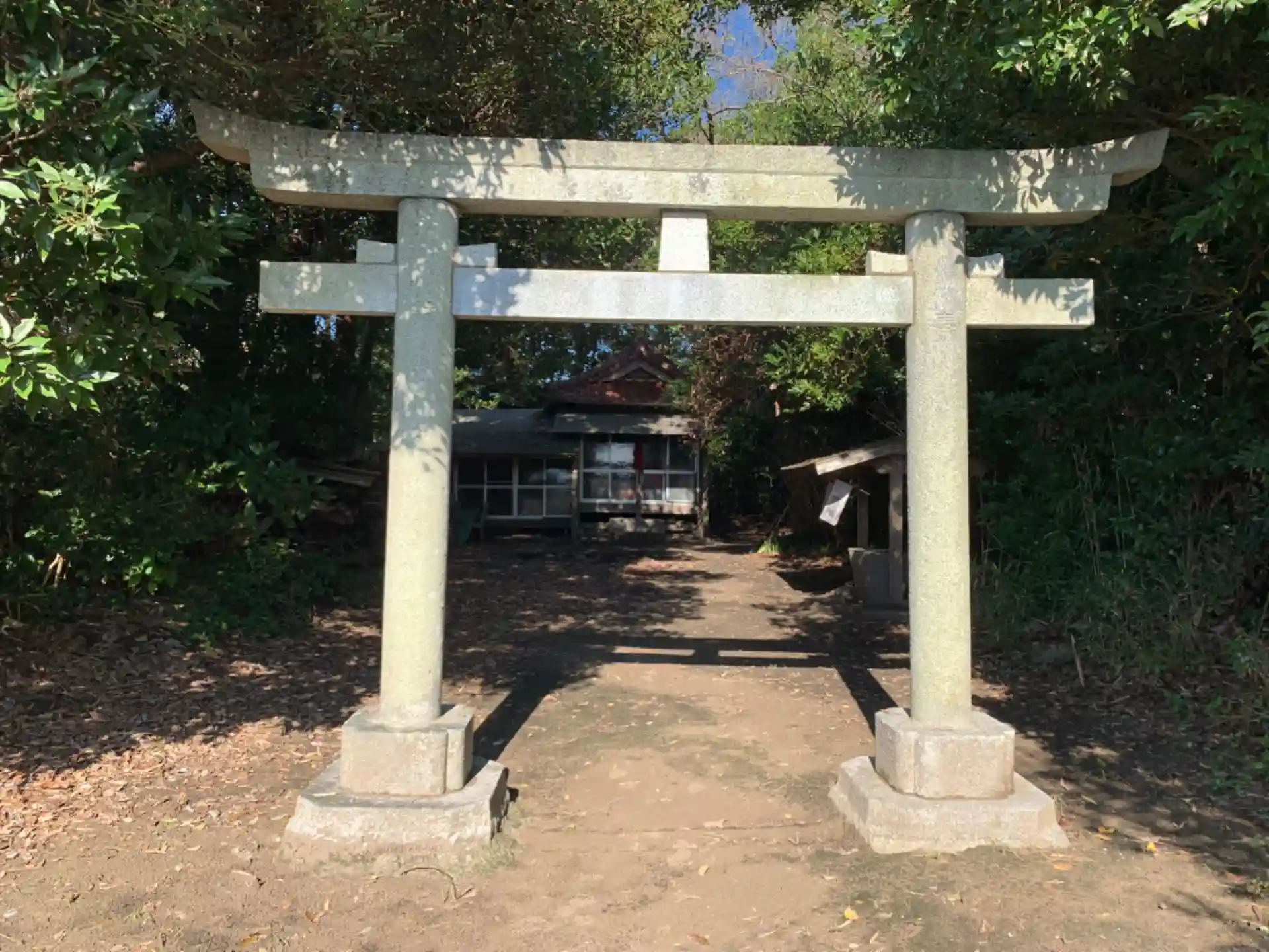 サッカー場脇の駐車場の奥にある神社。机と椅子があります。