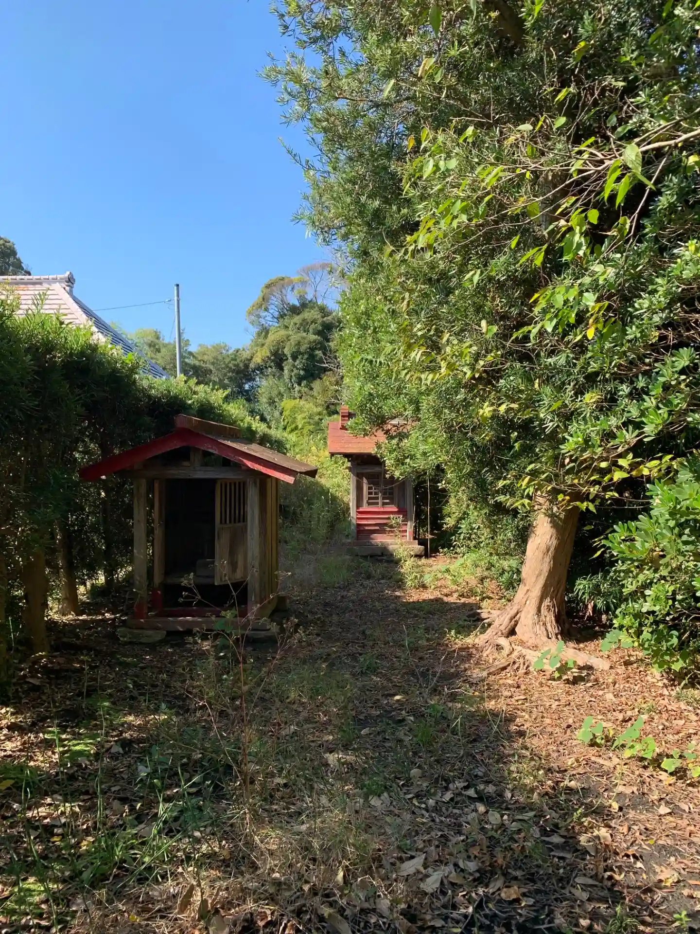自動車がたくさん置いてある民家の隣家の奥にある神社。