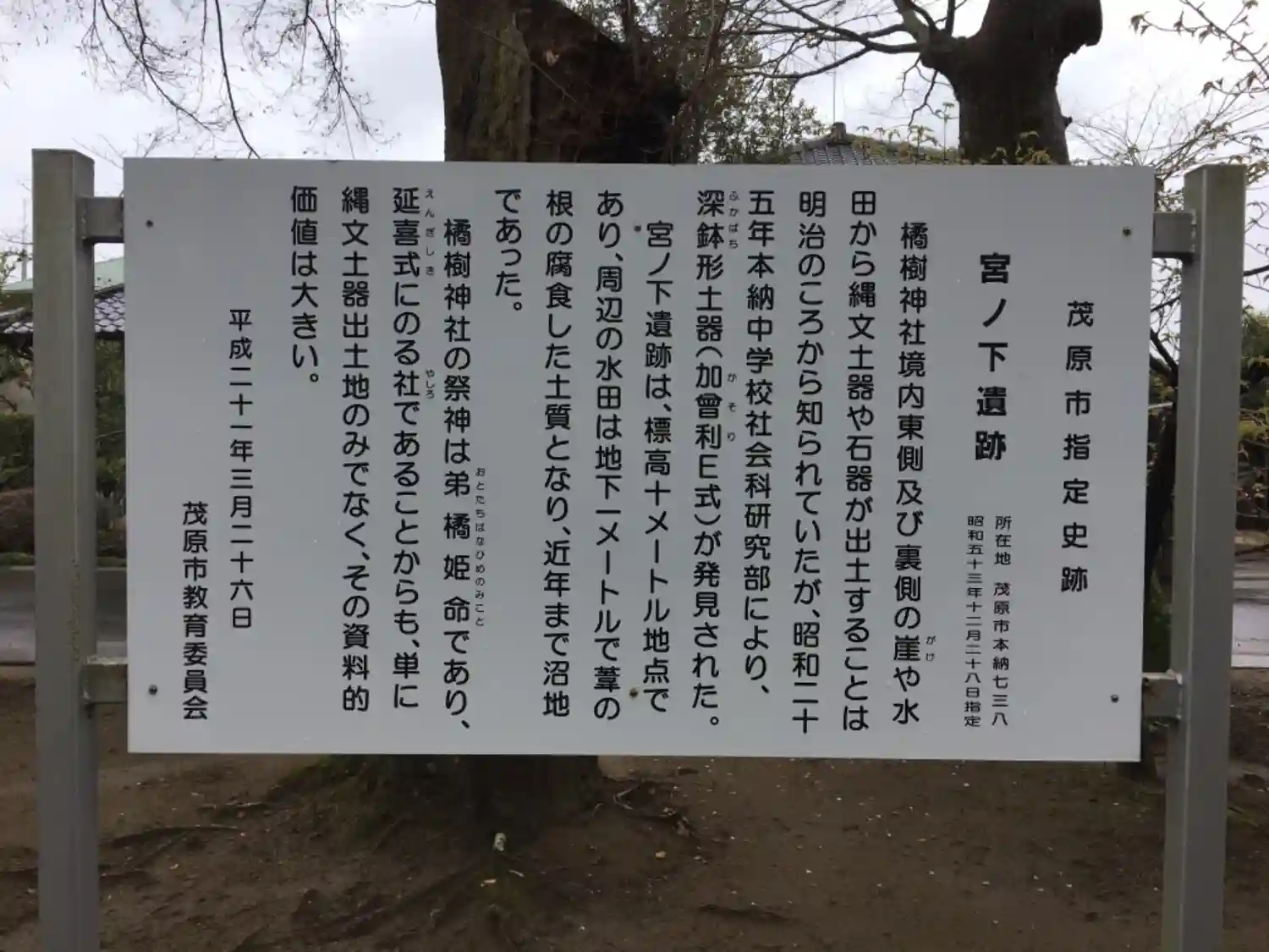 | ご由緒 | 社伝に日本武尊の御創建と伝え、「陽成天皇元慶元年5月17日授上総国勲5等正5位の上橘神 日本武尊 忍山宿禰2神を合祀す」と記す。延喜式内小社。正慶2年9月、寛政13年5月にそれぞれ改築。明治6年5月30日県社に列す。 |
