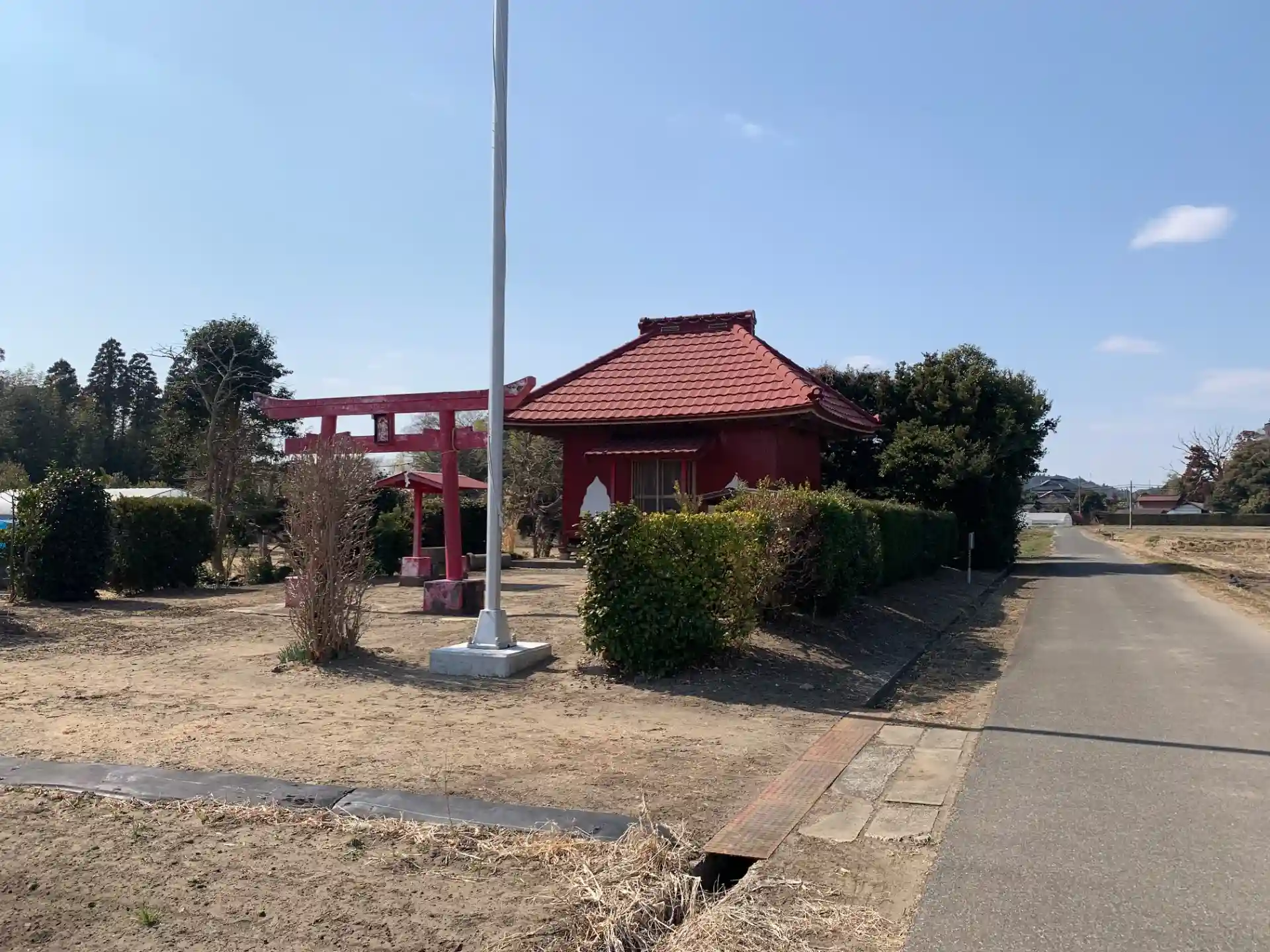 田んぼの中にある神社。境内に道祖神が置いてあります。社殿の白い塗装は、寺院建築によく見られる窓を模したものと思われます。