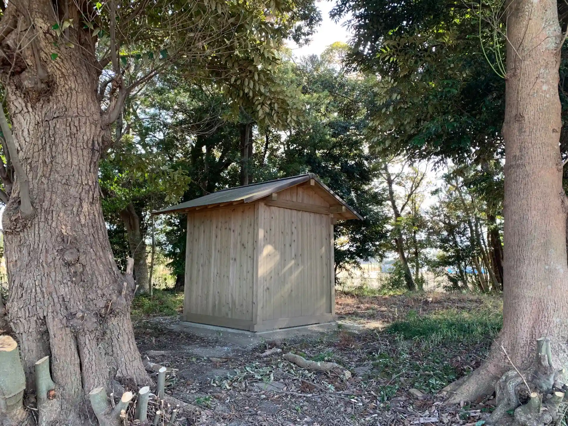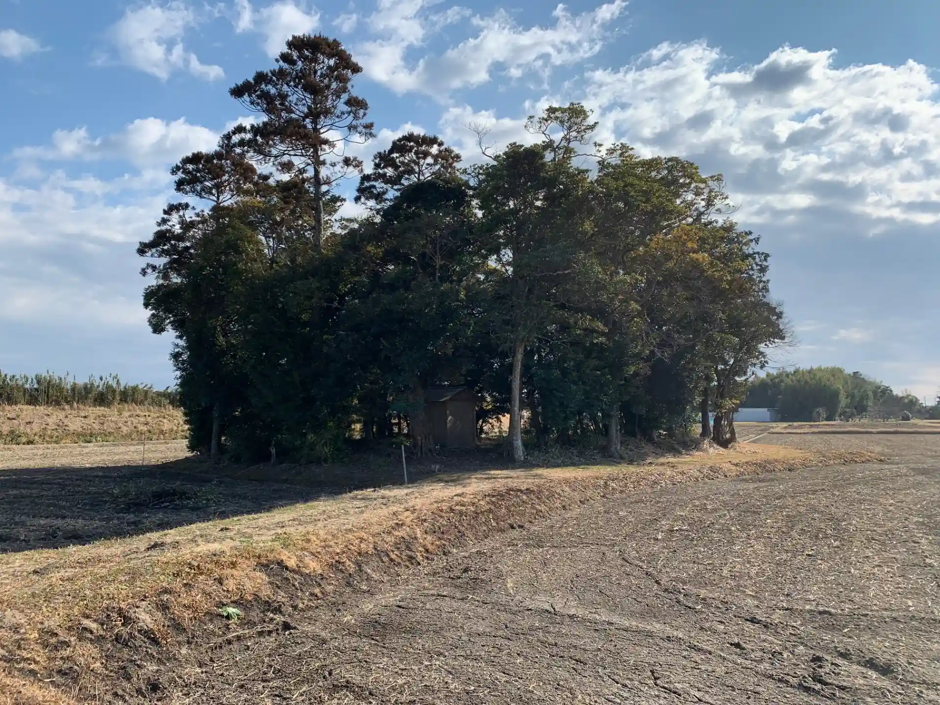 南白亀川沿いの田園地帯に浮かぶ小島。かつて建っていたお社の残骸が片付けられており、今は石祠があるのみです。