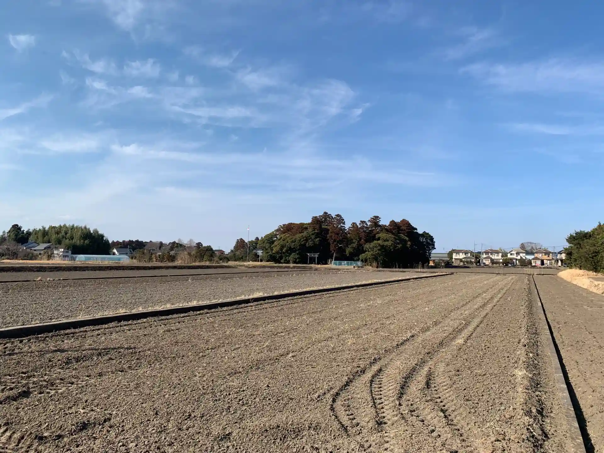 田んぼに浮かぶ小島のような神社。南向きの参道から田んぼの中を歩いてお参りします。