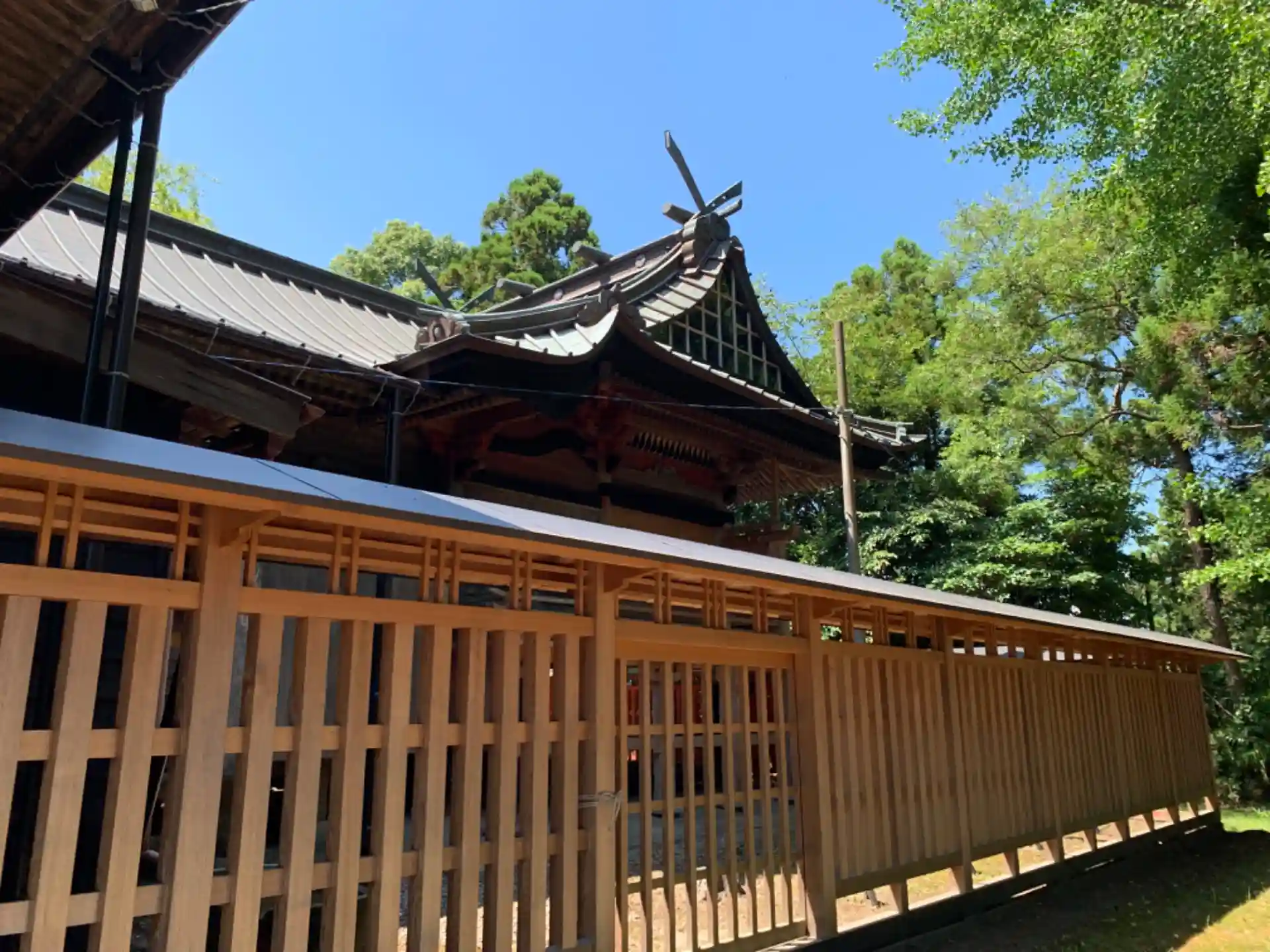 地名を冠した神社。地元の方が涼んでおり、手水鉢にある蛇口は飲める水だと教えてくれました。地元の方は謙遜していましたが、よく手入れされた素晴らしい神社です。拝殿の彫刻が見どころ。境内には神事に用いる的が置いてありました。