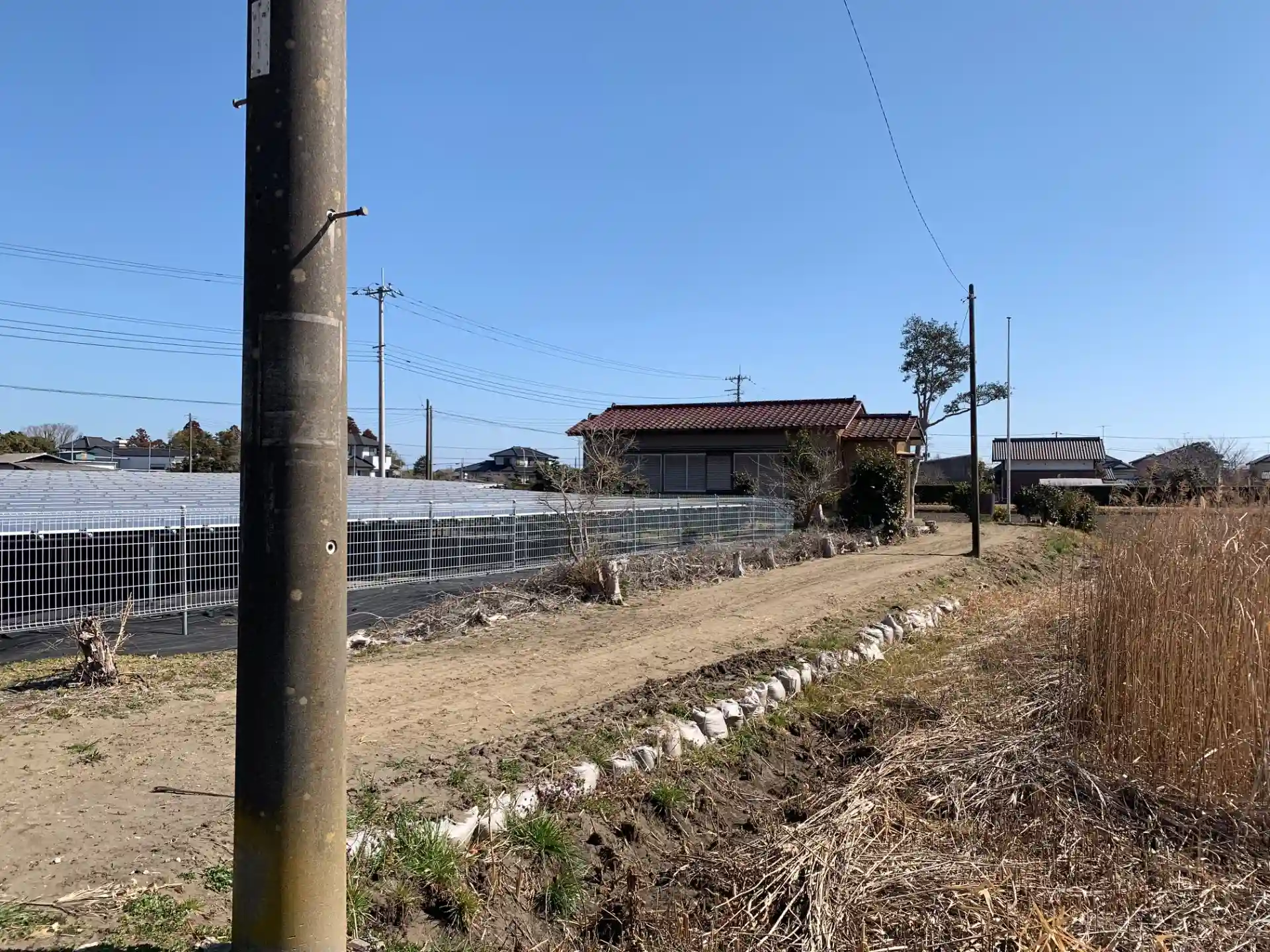 田んぼの中の集会所。国旗掲揚のためのポールから神社であることを推測できます。